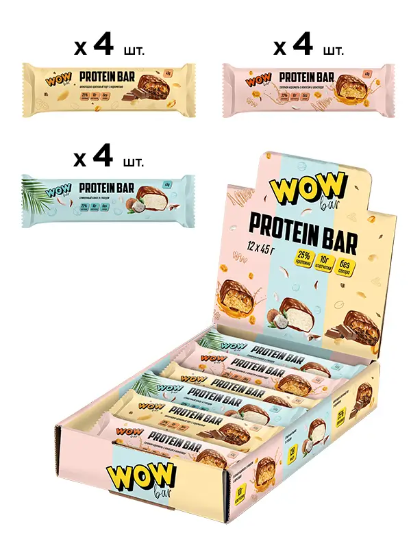 WOWBAR – это невероятно вкусная линейка протеиновых батончиков. Испытай истинный восторг, погрузившись в эйфорию вкуса нежных батончиков WOWBAR!