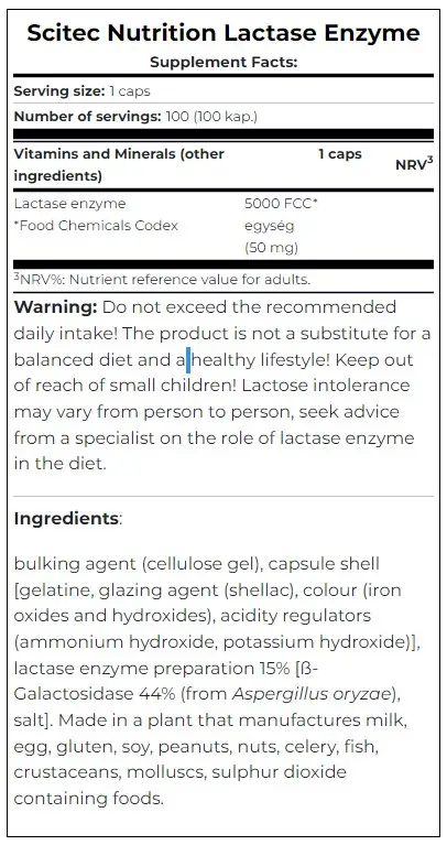 Лактаза (ß-галактозидаза) представляет собой пищеварительный фермент, расщепляющий лактозу молока и молочных продуктов на безвредные простые сахара, глюкозу и галактозу. Люди, у которых отсутствует этот фермент, не могут полностью утилизировать лактозу, что может привести к неприятным симптомам. Фермент лактаза улучшает переваривание лактозы у людей, которые испытывают трудности с перевариванием лактозы.* ЛАКТАЗА является идеальной добавкой для тех, кто хочет насладиться преимуществами сыворотки, казеина, казеината или молочных белков, но страдает непереносимостью лактозы. Обычно для переваривания 10-13 граммов лактозы требуется 2500 единиц FCC (обычно концентраты сывороточного белка содержат 5-6% лактозы). Для очень чувствительных потребителей с непереносимостью лактозы, которым требуется 100% конверсия, рекомендуется 10 000 единиц FCC за один прием пищи. 2 наши капсулы обеспечивают это количество фермента!