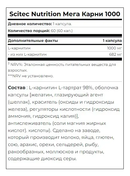 Mega Carni 1000 содержит 1000 мг L-карнитина L-тартрата на порцию (на капсулу). L-карнитин L-тартрат – самая популярная форма L-карнитина! Прием L-карнитина в форме капсул — это точный и удобный способ дозирования L-карнитина.
