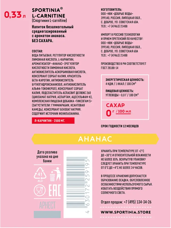 L- карнитин - 1500 мг. Витамины В12 - 0,22 мг., С - 1000 мг., биотин – 0,03 мг., РР - 3,5 мг. Пантотеновая кислота 1,4 мг., Фолиевая кислота 75,0 мг.
