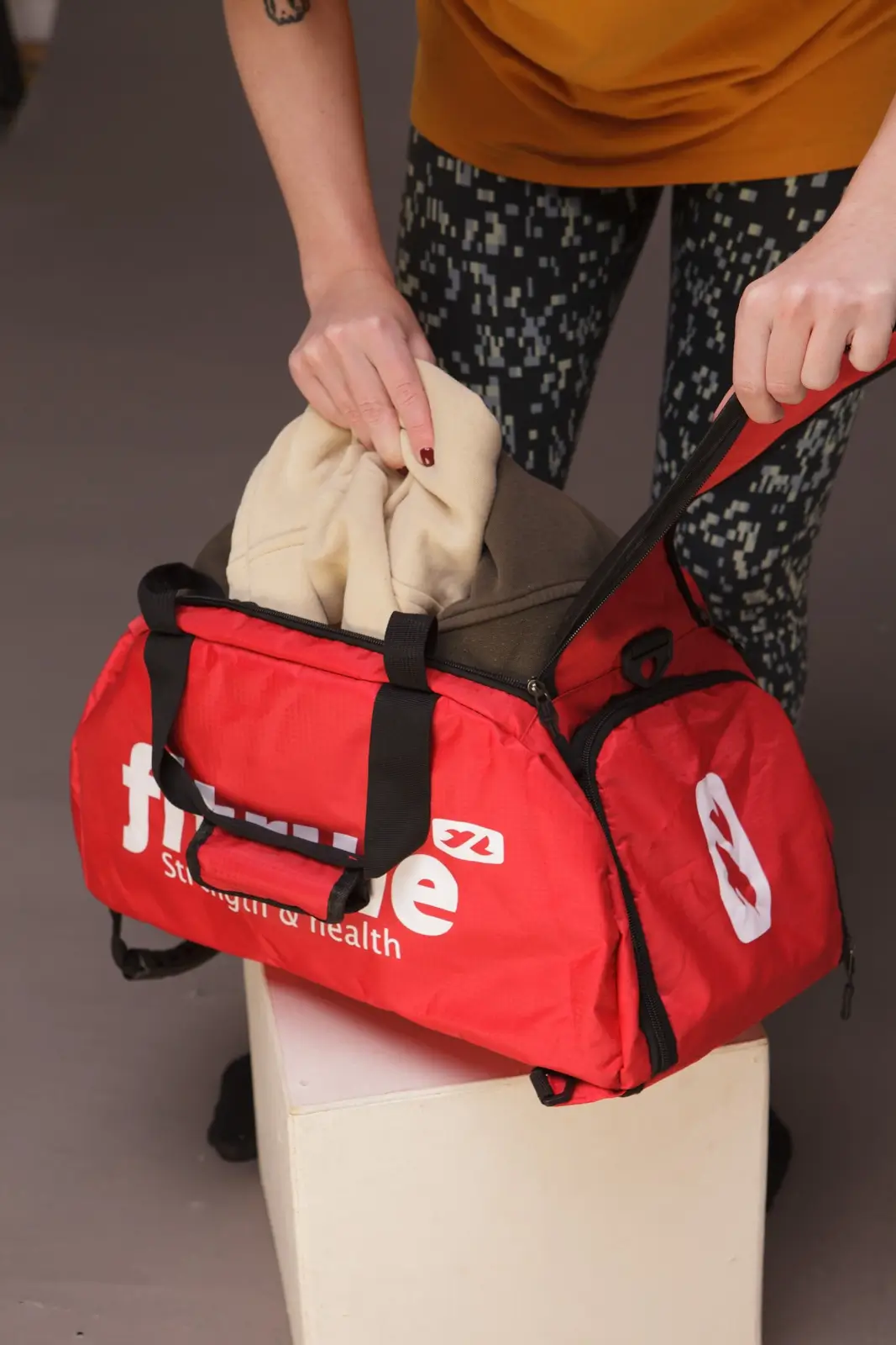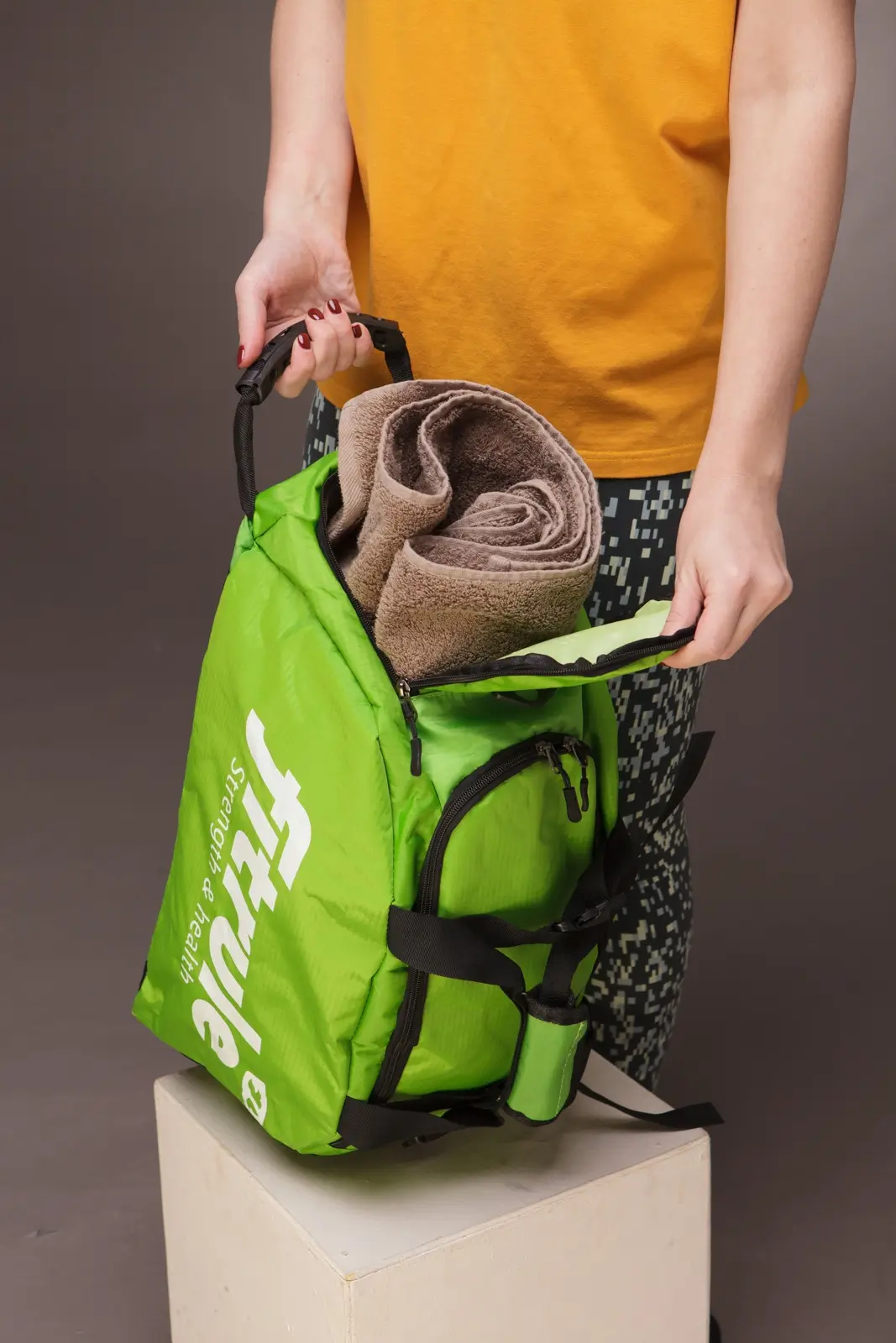 Спортивная сумка - рюкзак. Объем - 36 литров, размер - 48 на 26 на 23cм. Идеально подходит для тренировок, а так же для повседневного использования. Отлично вмещает в себя необходимую экипировку для тренировок. Сумка трансформер - используется и как рюкзак и как спортивная сумка. Ремни рюкзака убираются в специальный карман на молнии и достаются только при необходимости. Есть внутренний карман для обуви, а так же боковые карманы на молнии для ключей и прочей мелочи.