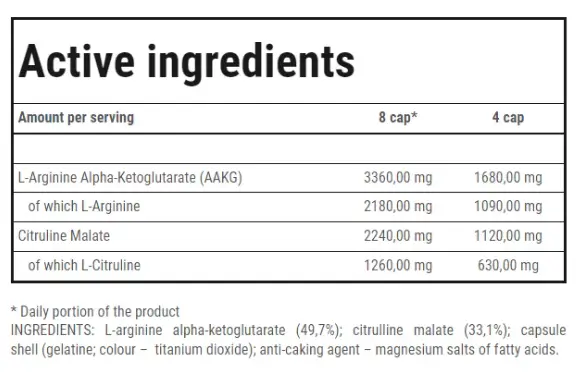 AAKG MEGA HARDCORE содержит альфа-кетоглутарат L-аргинина (AAKG) и L-цитруллин малат.
