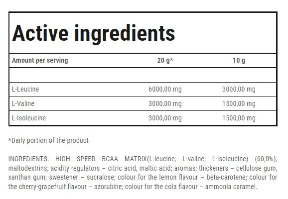 Trec Nutrition BCAA High Speed — это быстрорастворимая формула аминокислот с разветвленной цепью (BCAA), которая обеспечивает эффективную поддержку мышц во время и после тренировок. BCAA (лейцин, изолейцин и валин) являются ключевыми аминокислотами, способствующими росту и восстановлению мышц. Продукт идеально подходит для людей, занимающихся интенсивными тренировками, как в силовых видах спорта, так и в выносливости.