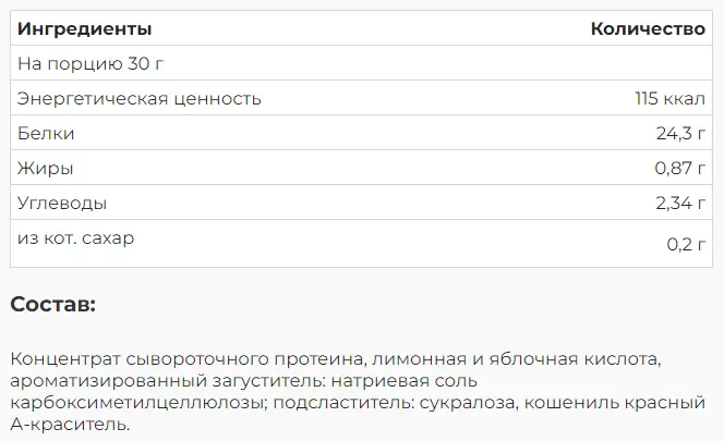 В состав 100% WHEY входит исключительно сывороточный белок, без примесей, снижающих содержание протеина в продукте. Концентрат сывороточного белка – это один из наиболее популярных и эффективных протеинов природного происхождения. Продукт идеально компенсирует недостаток белка, который возникает при повышенной потребности организма у людей, занимающихся профессиональным спортом, культуризмом, а также у людей, находящихся на диете для похудения.
