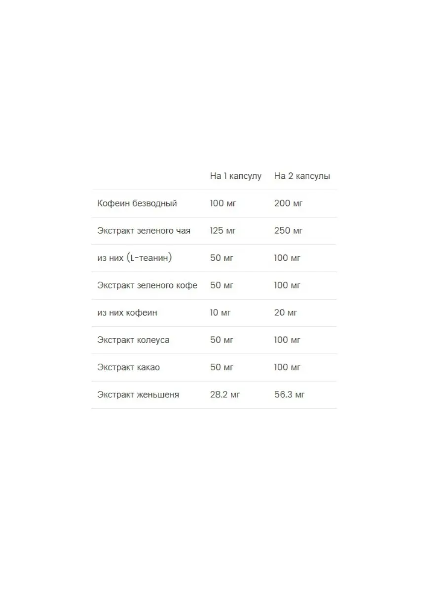 Кофеин ангидрид, экстракт зеленого чая+ (Camellia Sinensis), желатин, экстракт зеленого кофе (С. Canephora Robusta), экстракт какао (Theobroma cacao), экстракт колеуса (Coleus forskohlii), L-теанин, экстракт женьшеня (Panax ginseng), антислеживатель (E470b), красители (E172, E171, E129*). Может содержать следы молочных продуктов (включая лактозу), глютен-содержащих злаков, соевых бобов и яиц. *Может иметь негативное влияние на активность и внимание детей
