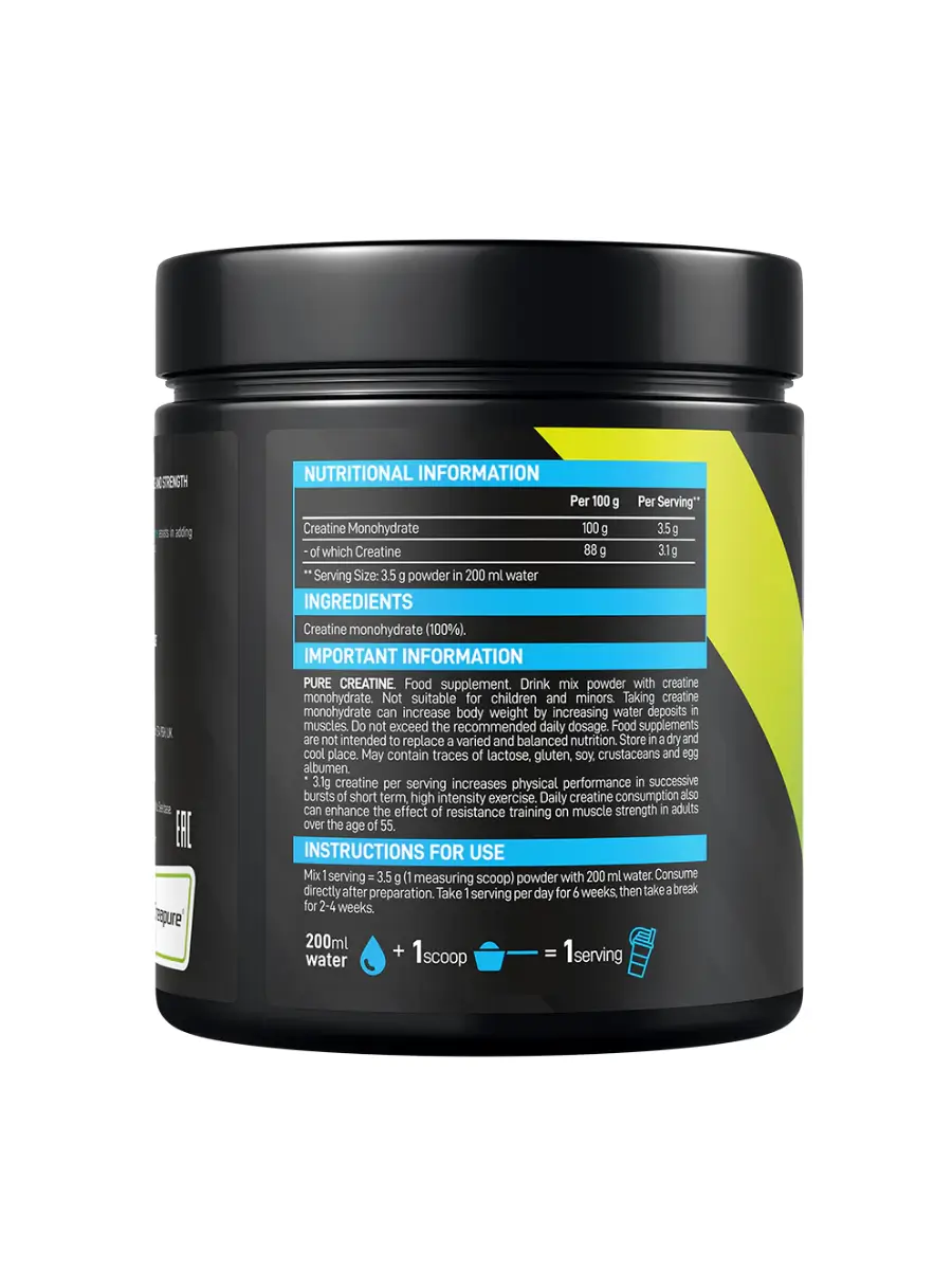 В основе Pure Creatine – чистый креатина моногидрат марки Creapure, представленный в ультра-микронизированной форме. Его основное предназначение – преобразование энергии за счет повышения в организме уровня креатинфосфата, который преобразуется в АТФ и обеспечивает организм энергией. Интенсивная работа мышц требует максимальной энергии, что связано с усиленным расходованием запасов креатинфосфата, поэтому его высокая концентрация в организме обеспечивает возможности для повышения выносливости во время серьезных физических нагрузок. Молекулы креатина при поступлении в мышечные клетки притягивают большое количество воды, что способствует активизации процессов белкового синтеза, а также визуальному увеличению объемов мускулатуры.