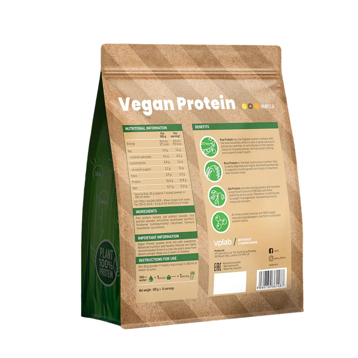 VPLab's Vegan Protein — это тщательно разработанная смесь из трех премиальных источников растительного белка: изолят горохового белка, овсяного белкового порошка и рисового белкового порошка. Предлагая отличный вкус и полный аминокислотный профиль, эта белковая смесь содержит 76% белка. Каждая упаковка 500 г обеспечивает 16 порций, делая его идеальным выбором для тех, кто стремится поддерживать мышечную массу, здоровье сердца и достигать ежедневных белковых целей с веганской диетой.