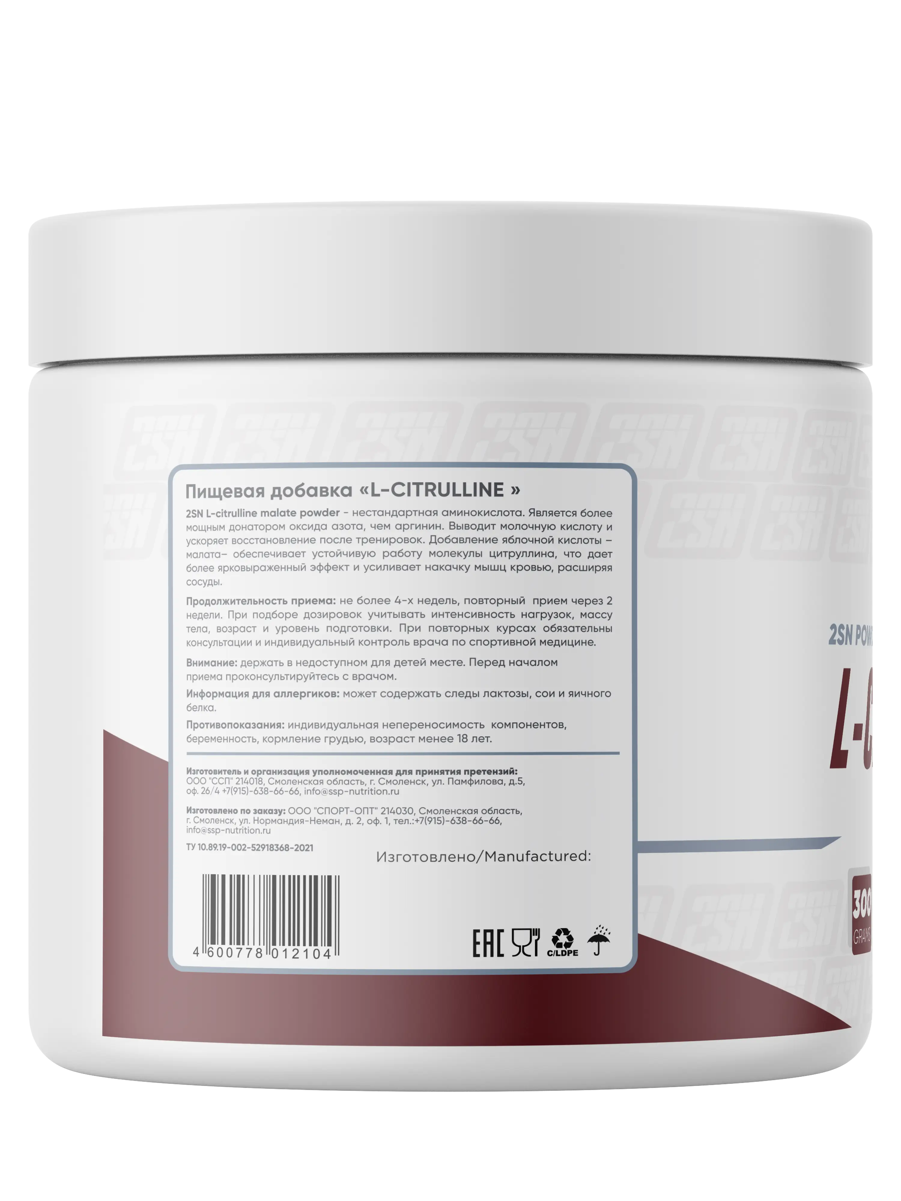 2SN Citrulline malate powder – это порошковый цитруллин малат. Соединение нестандартной аминокислоты цитруллина с яблочной кислотой. Цитруллин является конечной стадией превращения аргинина в оксид азота. То есть приём цитруллина дает более мощный и быстрый эффект, без промежуточных преобразований. Для достижения того же эффекта, что и аргинина (образование оксида азота и пампинг), цитруллин употребляется в меньшей дозировке (в два раза)