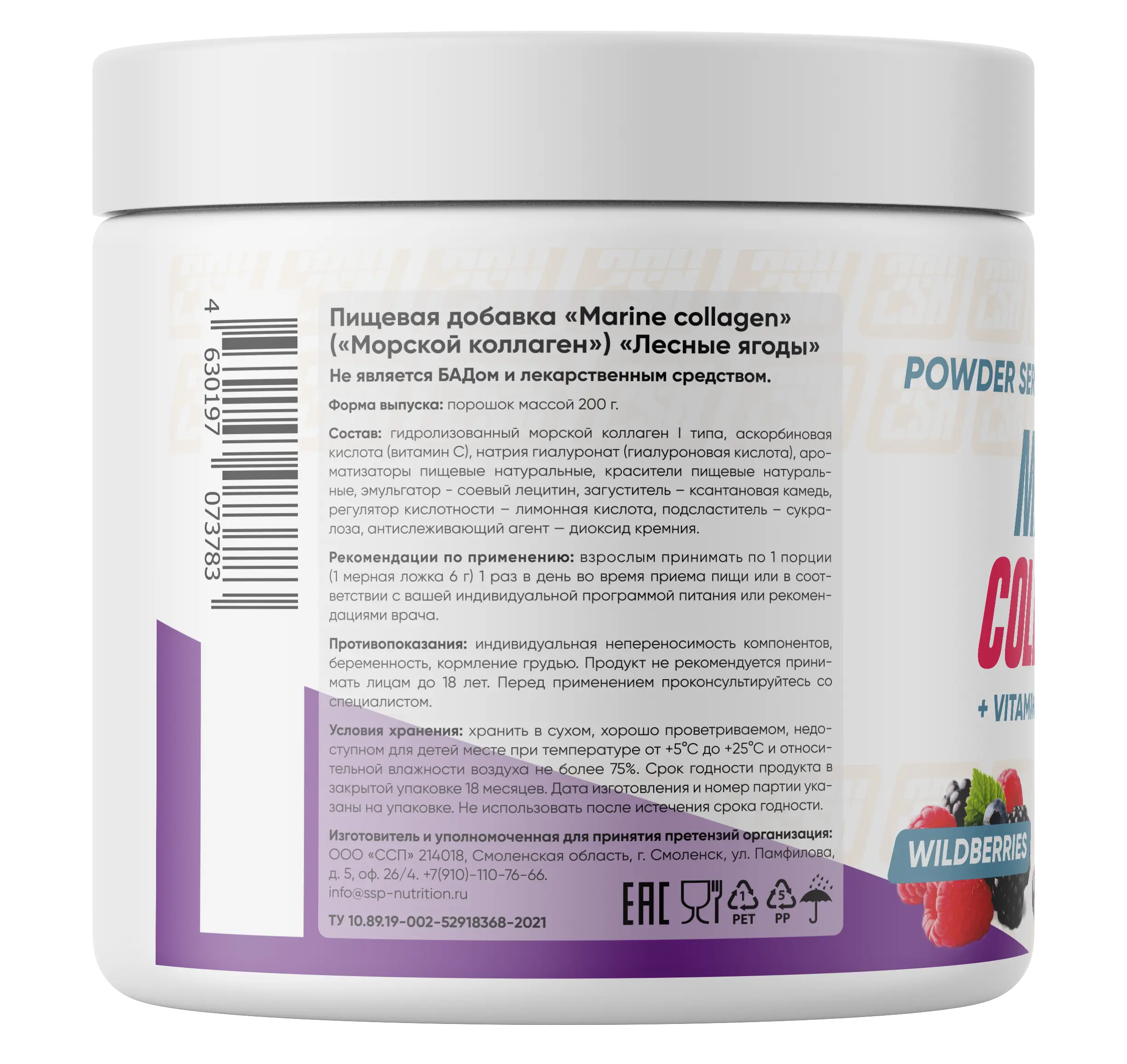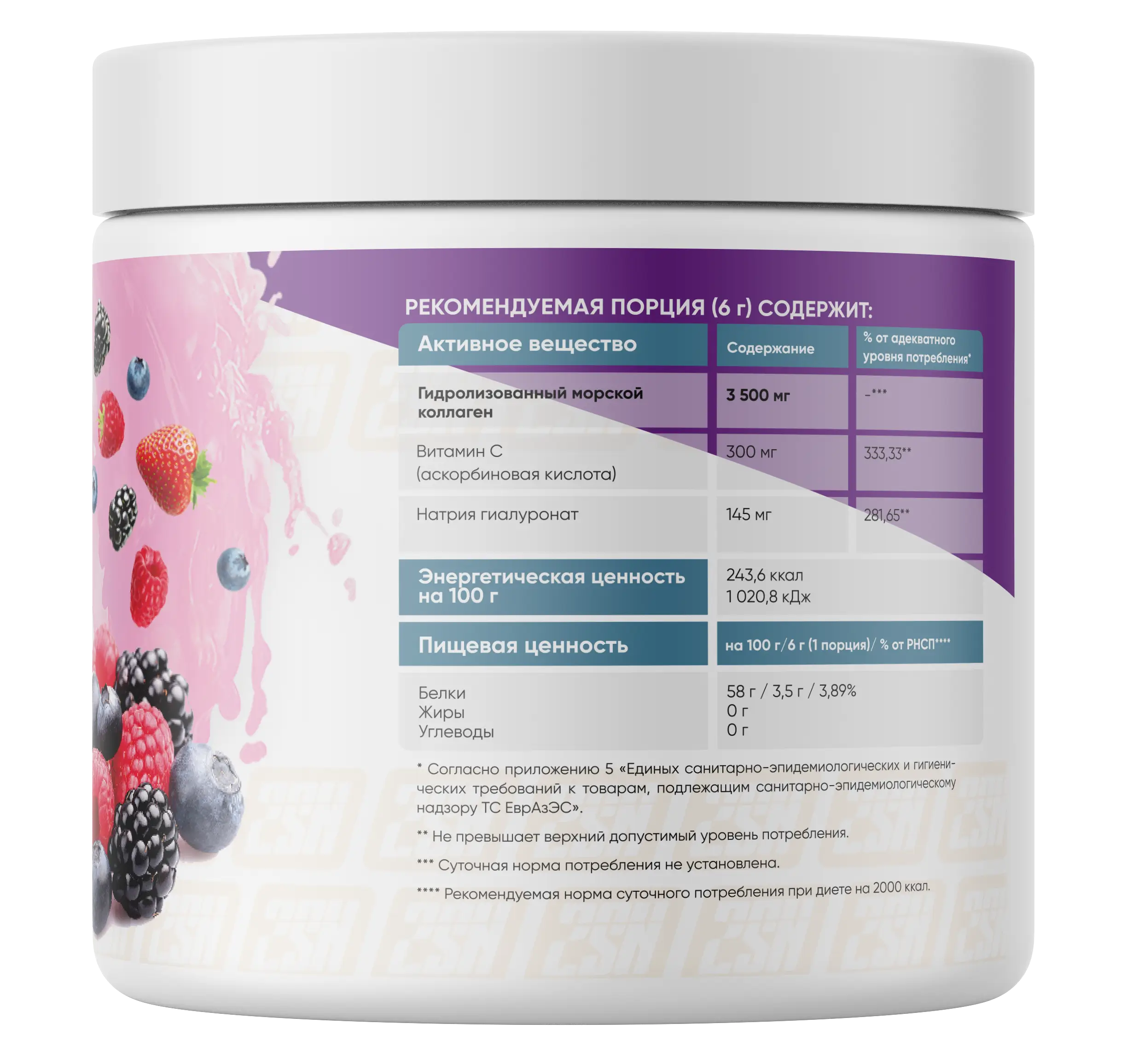 Состав: гидролизованный морской коллаген | типа, аскорбиновая кислота (витамин С), натрия гиалуренат (гиалуроновая кислота), аромотизаторы пищевые натуральные, красители пищевые натуральные, эмульгатор - соевый лецитин, загуститель — ксантановая камедь, регулятор кислотности — лимонная кислота, подсластитель - сукралоза, антислеживающий агент — диоксид кремния.