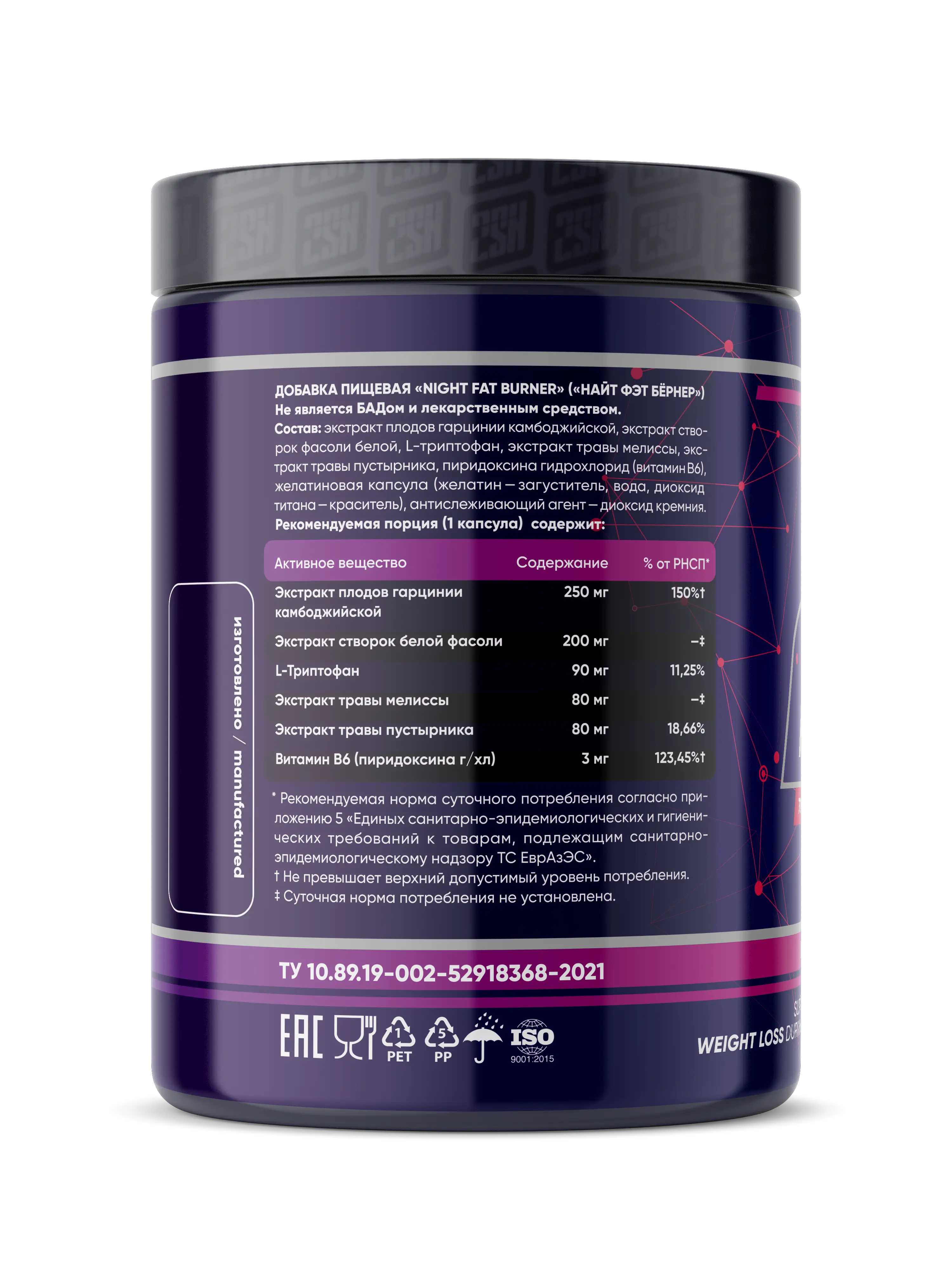 Так же 2SN Night Fat burner содержит ингредиенты, влияющие на окисление жира и регуляцию уровня сахара в крови, за счет снижение толерантности клеток к глюкозе. Это существенно снижает риск превращения углеводов в жир и отложение его под кожей.