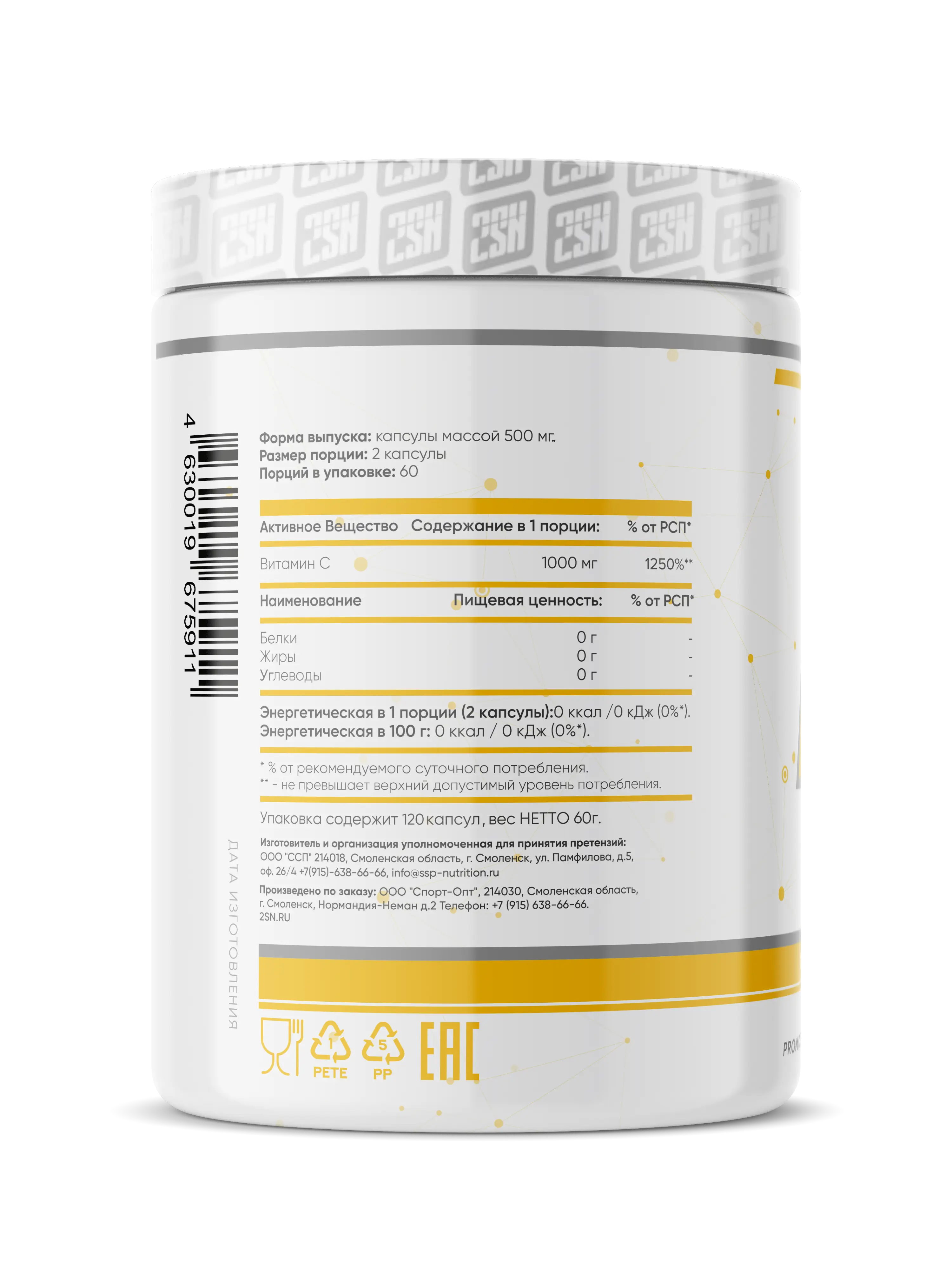 Состав: Витамин С (аскорбиновая кислота), твердая капсула (желатин, красител-диоксид титана Е171).