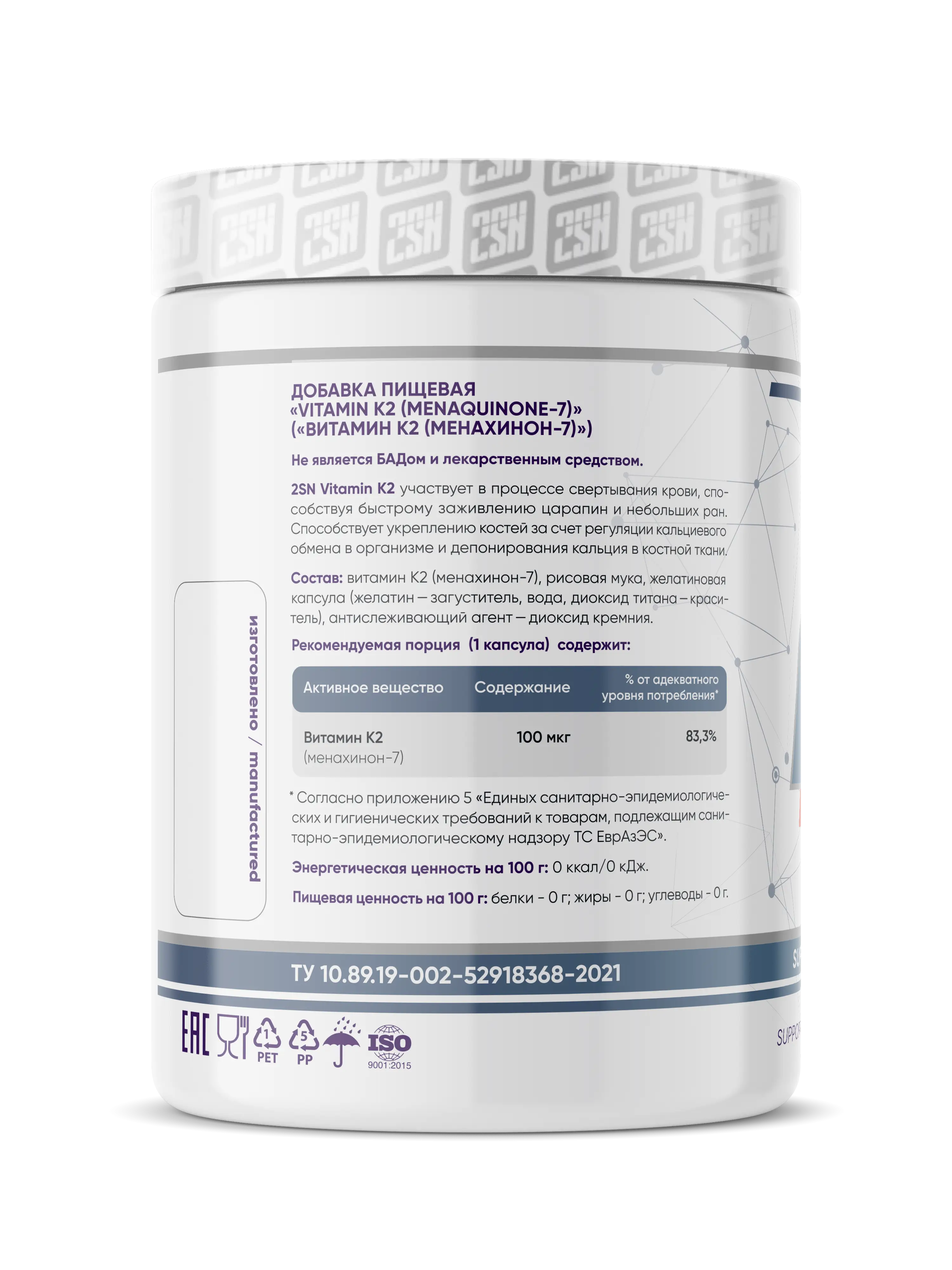Состав: витамин К2 (менахинон-7), рисовая мука, желотиновоя капсула (желатин — загуститель, вода, диоксид титона - кросить) антислеживающий агент — диоксид кремния.