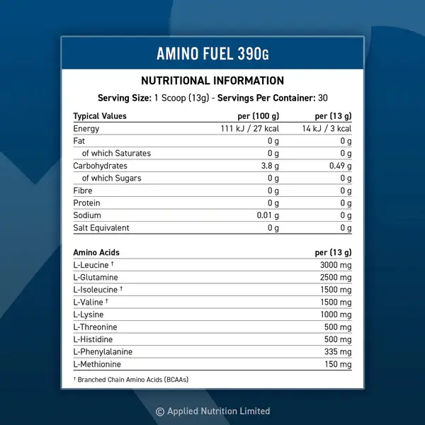 Amino Fuel - это идеальная оптимальная смесь, содержащая 11 г аминокислот на порцию, 9 г из которых являются незаменимыми аминокислотами (EAA), включая 6 г аминокислот с разветвленной цепью (BCAA) в соотношении 2: 1: 1 (3000 мг L-лейцина, 1500 мг L-изолейцина, 1500 мг L-валина) сдополнительно 2500 мг L-глютамина.