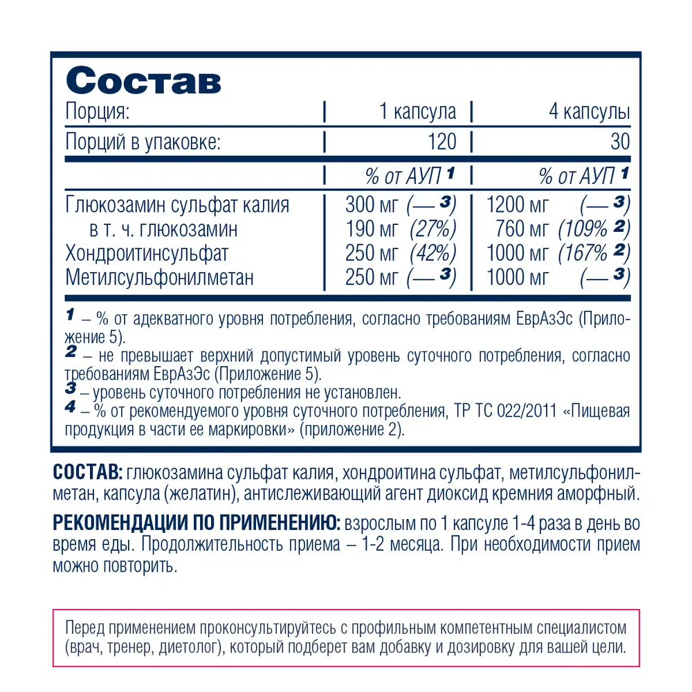 В Glucosamine + Chondroitin + MSM для суставов содержится дневная норма следующих веществ: