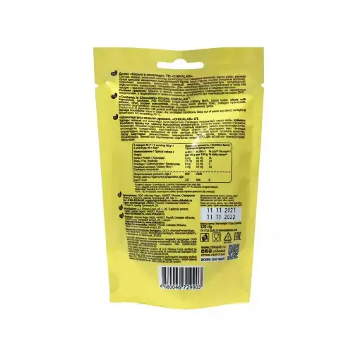 Состав: кешью, молочный шоколад (олигофруктоза (пищевые волокна), масло какао, молоко сухое цельное, концентрат сывороточного белка, какао тёртое, инулин (пищевые волокна), гидролизат коллагена, эмульгатор (соевый лецитин), ароматизаторы натуральные, подсластитель (сукралоза)), глянцеватель.