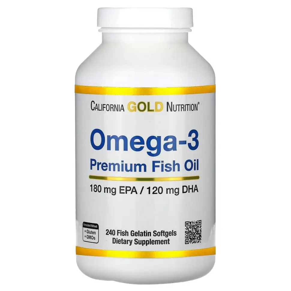 California Gold Nutrition Omega-3 Premium 240 капсул — высококачественное рыбье масло из холодноводных рыб, содержащее чистые и эффективные формы EPA и DHA. Продукт поддерживает здоровье сердца, мозга, глаз и суставов, а также способствует снижению воспалений.