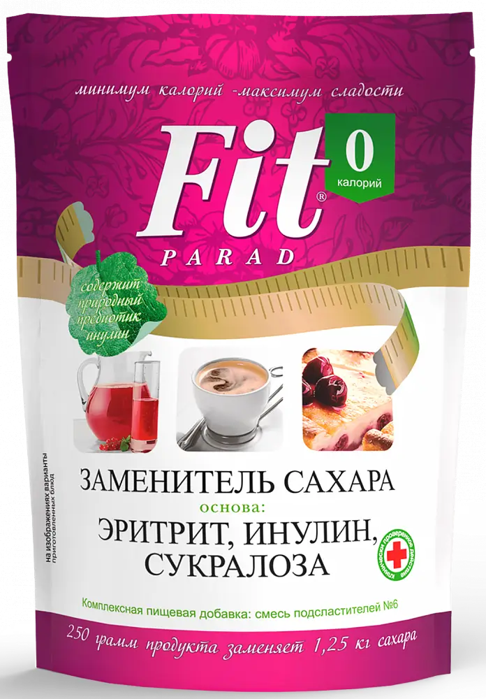 Рекомендации по применению: 1 г смеси ФитПарад №6 заменяет 5 г сахара, то есть 250 грамм продукта заменяет 1,25 кг сахара. Смесь подсластителей ФитПарад №6 может использоваться в производстве продуктов для больных сахарным диабетом, а также для целевой группы потребителей, следящих за своим весом.