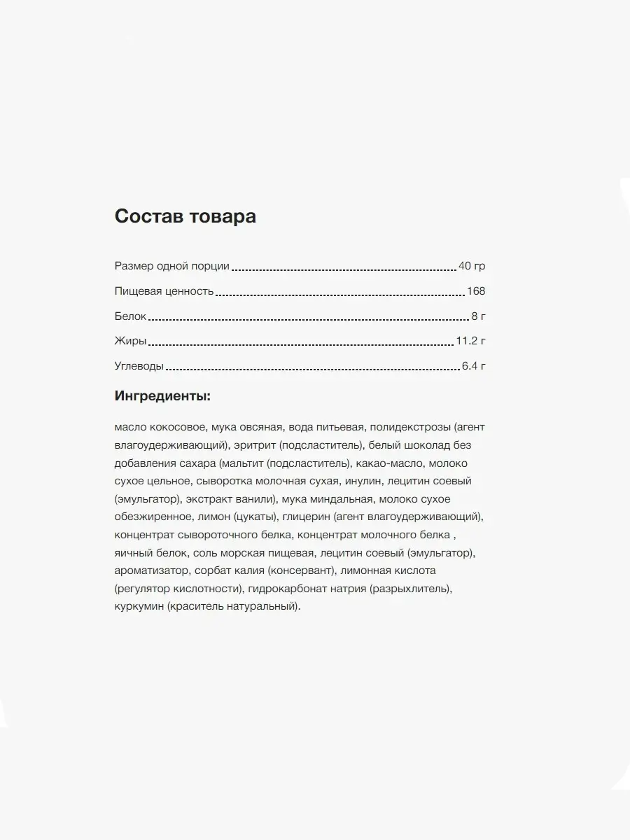 Состав Fitnes SHOCK: кокосовое масло, овсяная мука, полидекстроза, эритрит (подсластитель), белый шоколад без сахара, миндальная мука, сухое обезжиренное молоко, цукаты лимона, концентрат сывороточного и молочного белка, яичный белок, морская соль, соевый лецитин (эмульгатор), разрыхлитель, куркумин (натуральный краситель).