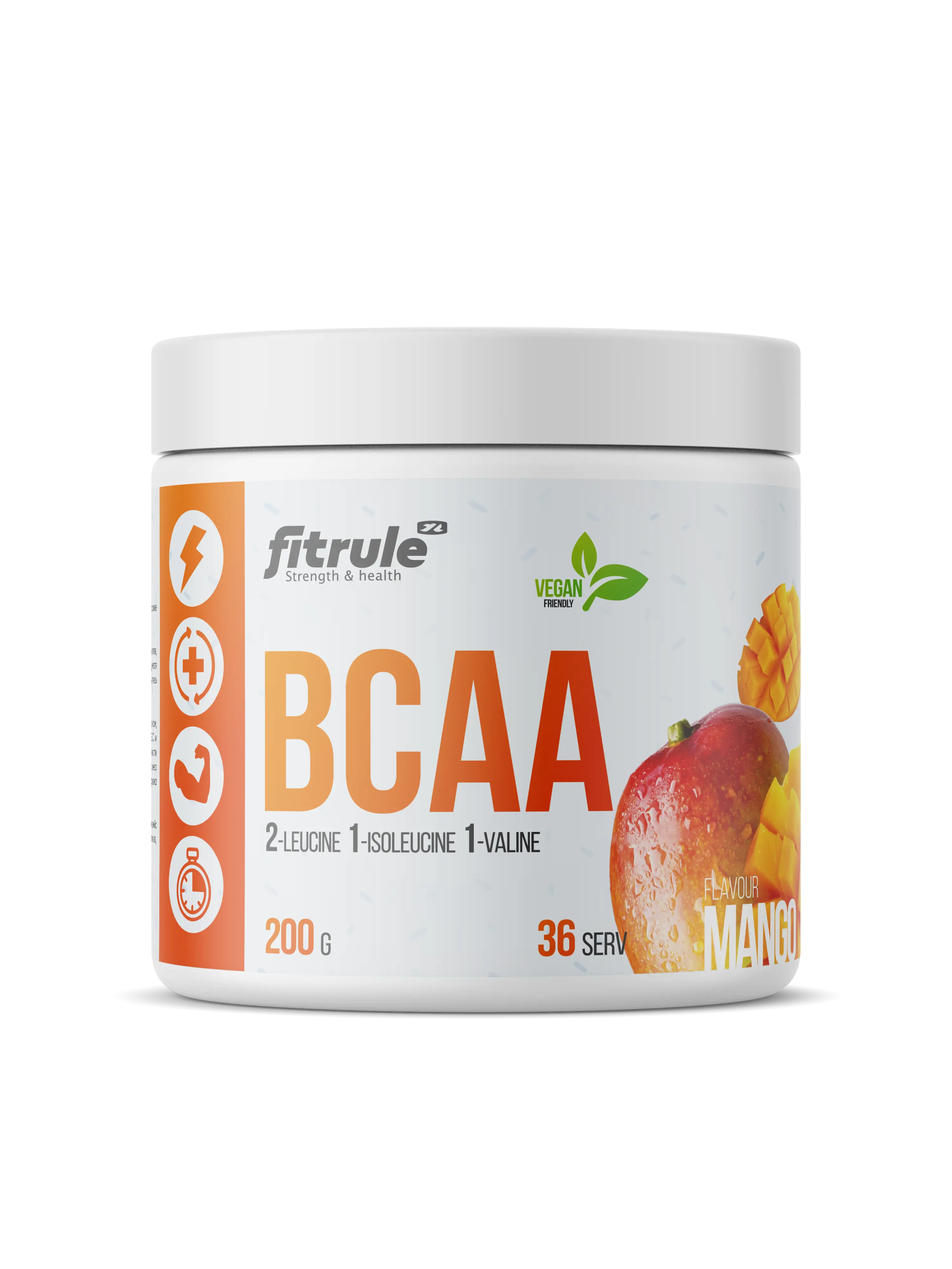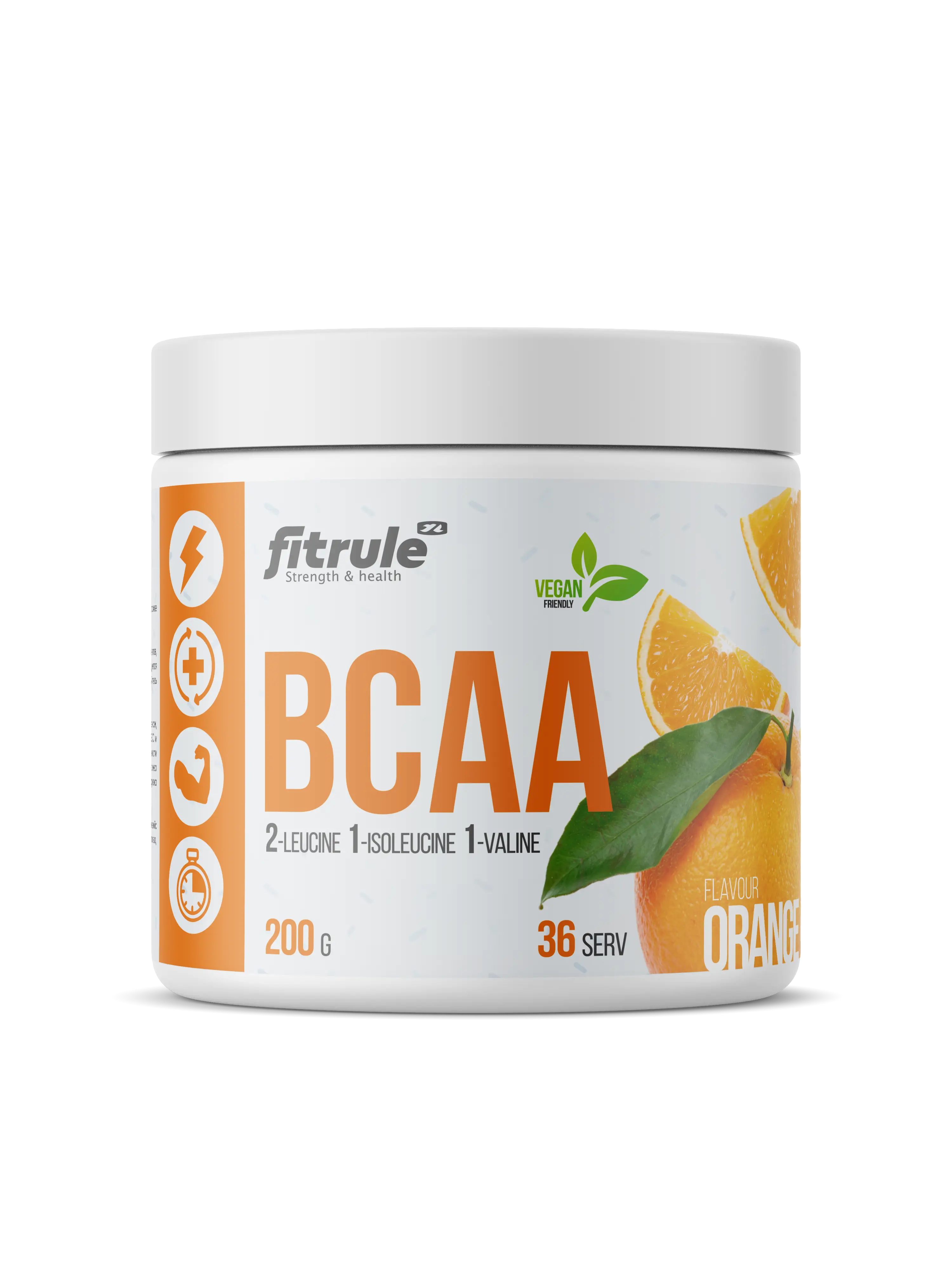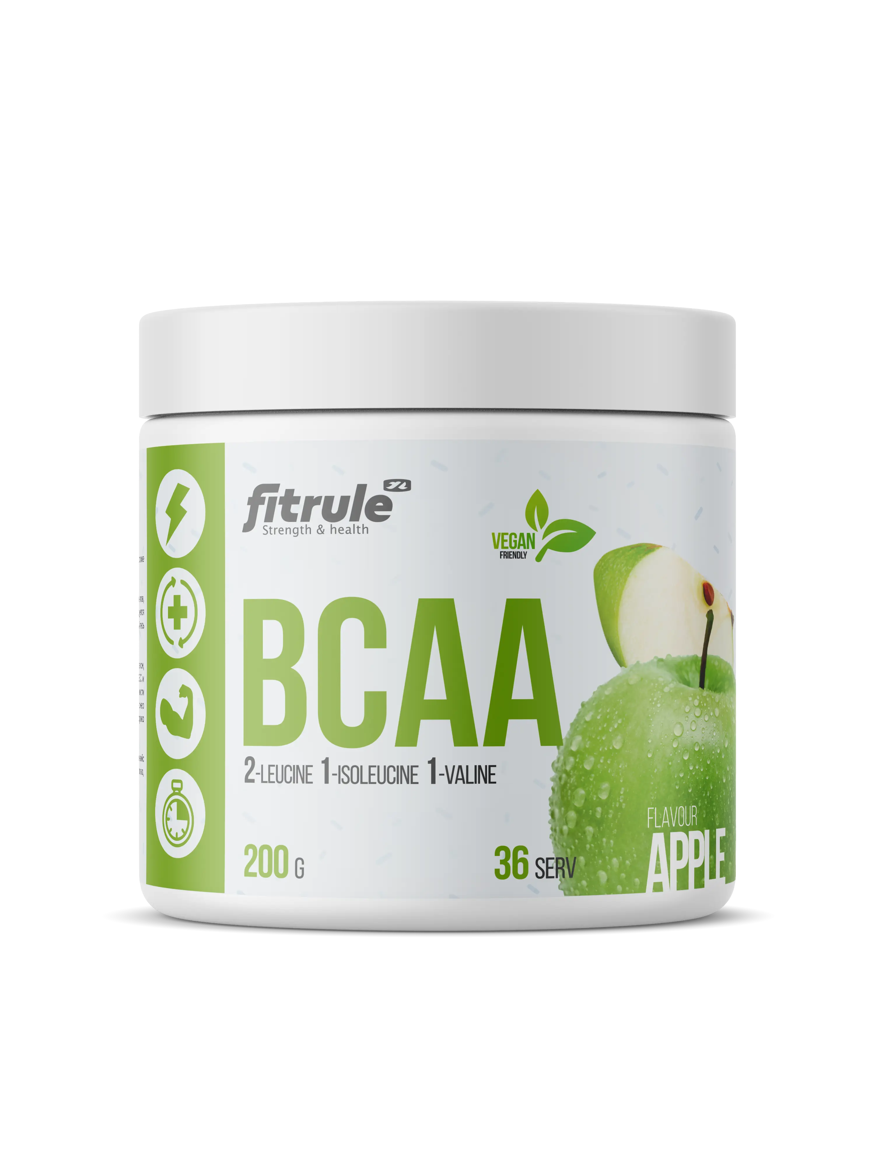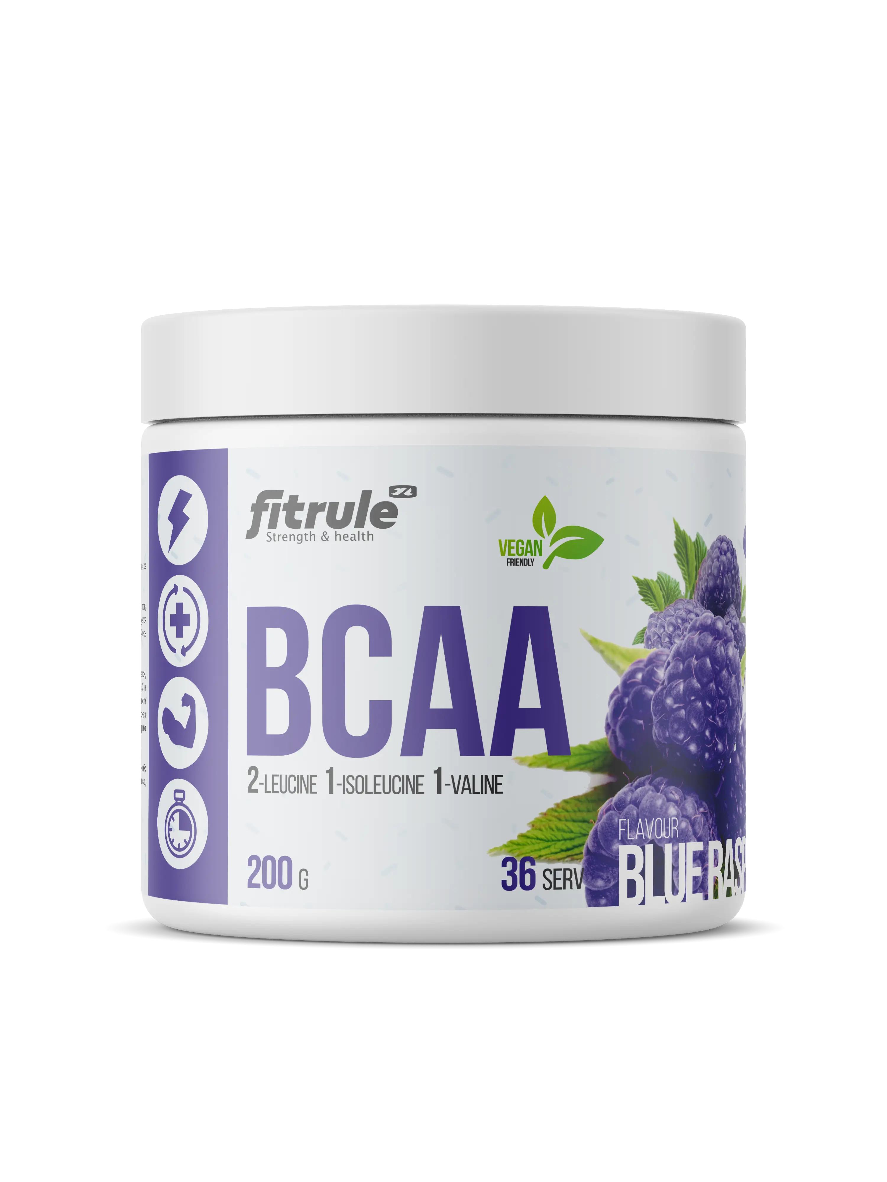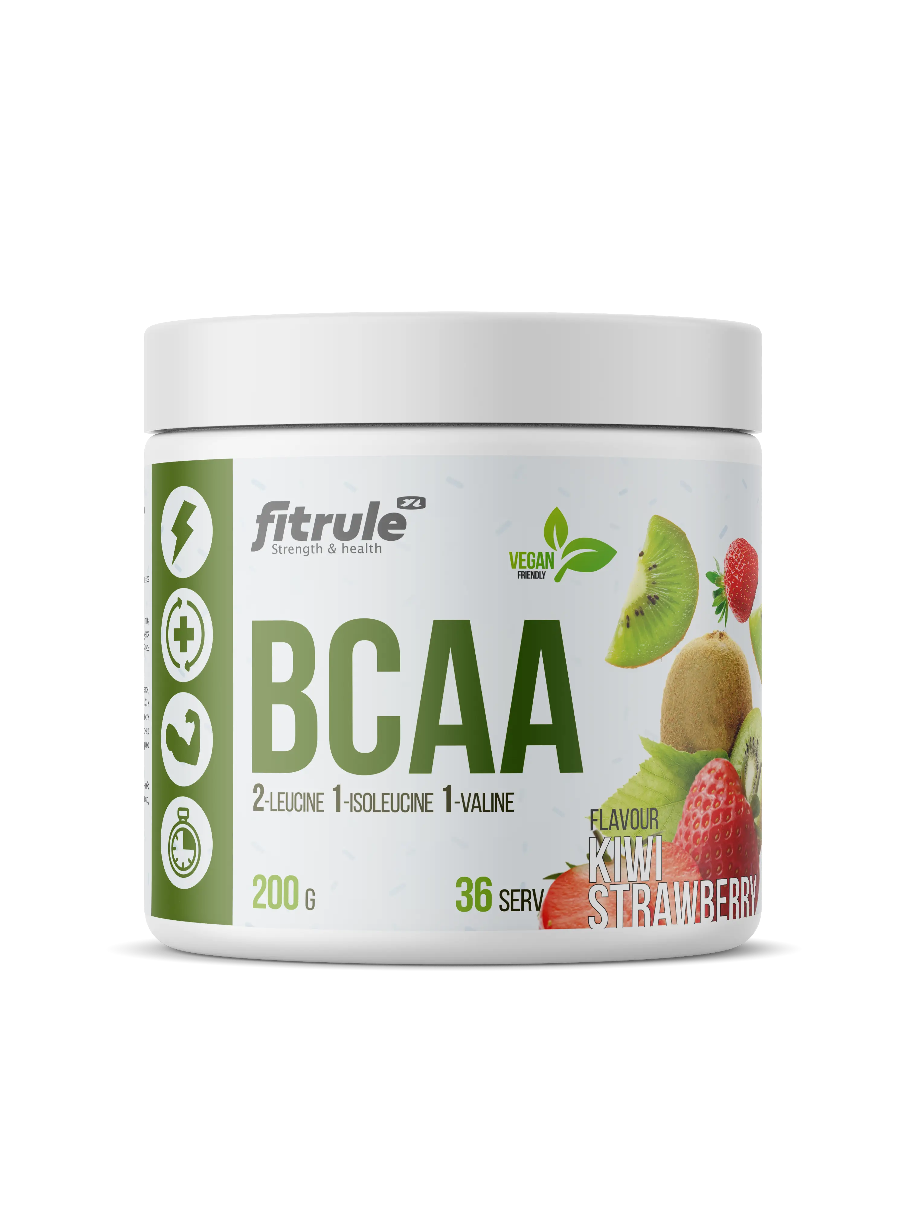 Fitrule BCAA Powder – это аминокислотный комплекс, включающий три наиболее важных для мышц аминокислоты – лейцин, изолейцин и валин. Эти аминокислоты выполняют три главных для организма функции: восстановление мышиной ткани, защита мышц от катаболизма и поддержание уровня энергии во время нагрузки.