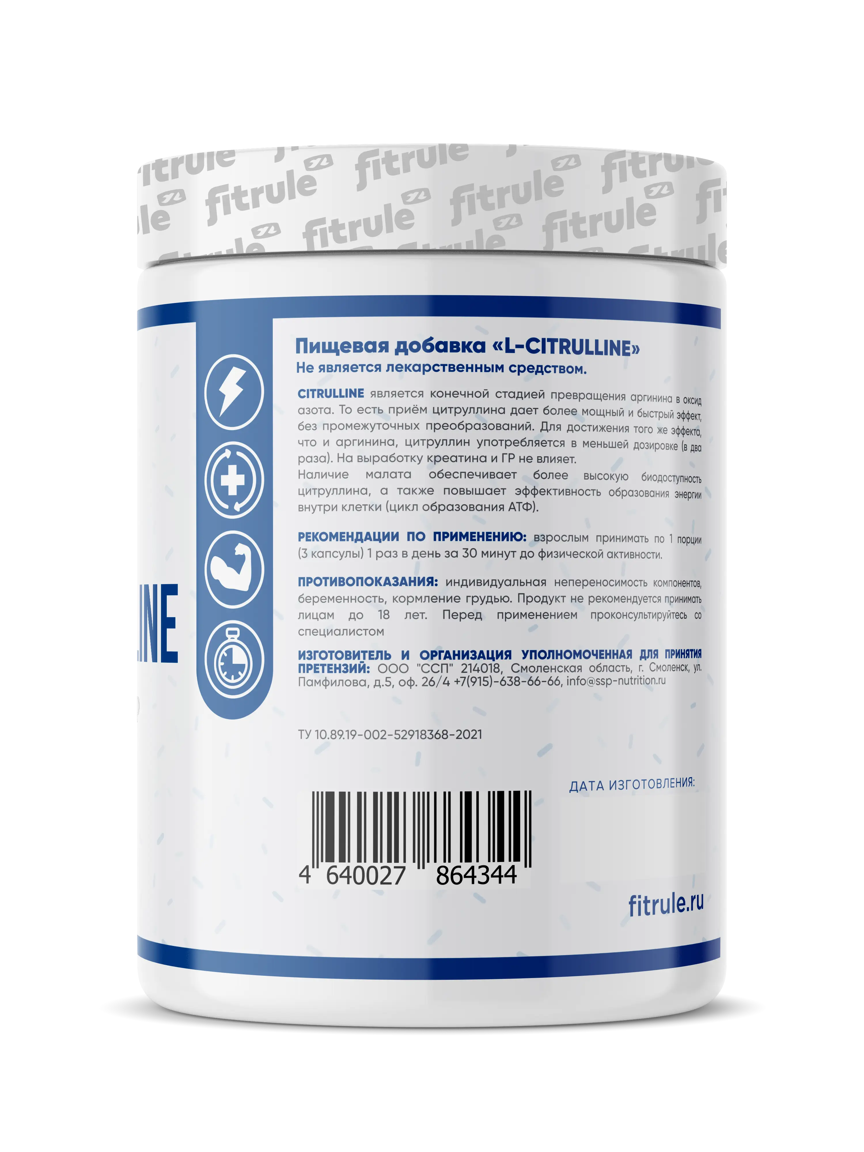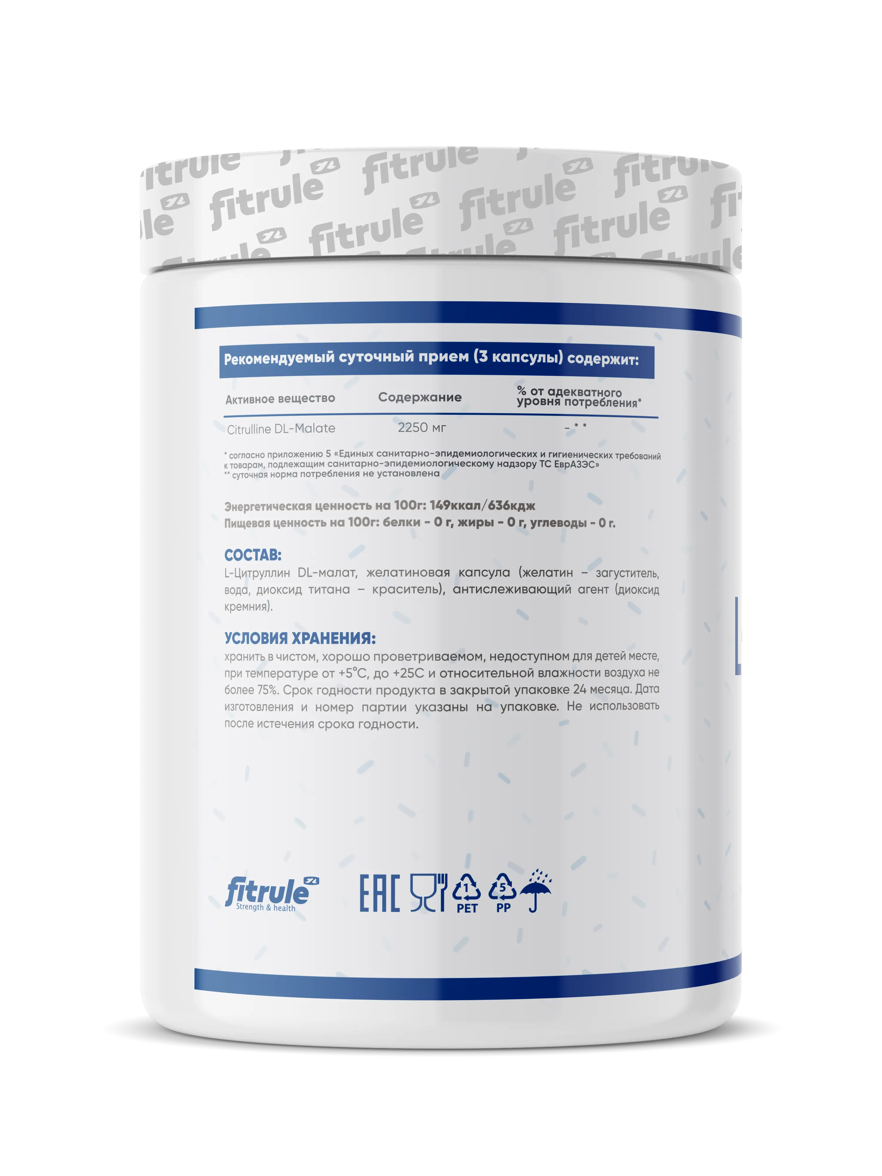 Fitrule Citrulline Malate – это нестандартная аминокислота цитруллин в соединении с яблочной кислотой (малатом). Цитруллин это более мощный донатор оксида азота, чем аргинин. То есть приём цитруллина дает более сильный и длительный эффект. Для достижения того же действия, что и у аргинина (образование оксида азота и пампинг), цитруллин употребляется в меньшей дозировке (в два раза).