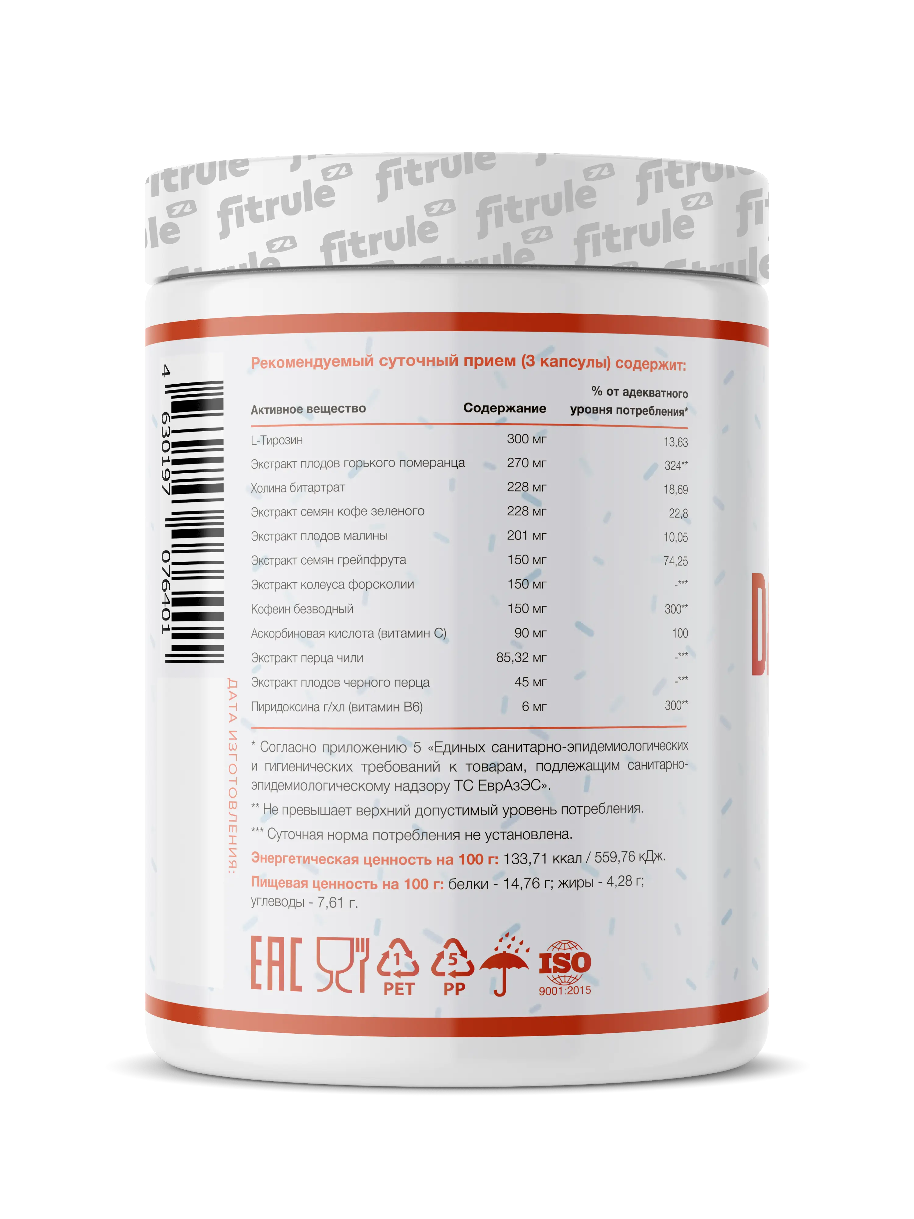 Состав: L-тирозин; Экстракт плодов горького померанц, холина битартрат (витамин В), экстракт семян зеленого кофе, экстракт плодов малины, экстракт семян грейпфрута, экстракт колеуса форсколии, кофеин безводный, аскорбиновая кислота (витамин С), экстракт перца чили, экстракт плодов черного пера, гиридоксина гидрохлорид (витамин Вб), желатиновая капсула (желатин — загуститель, вода, диоксид титана — краситель), антислеживающий агент — диоксид кремния.