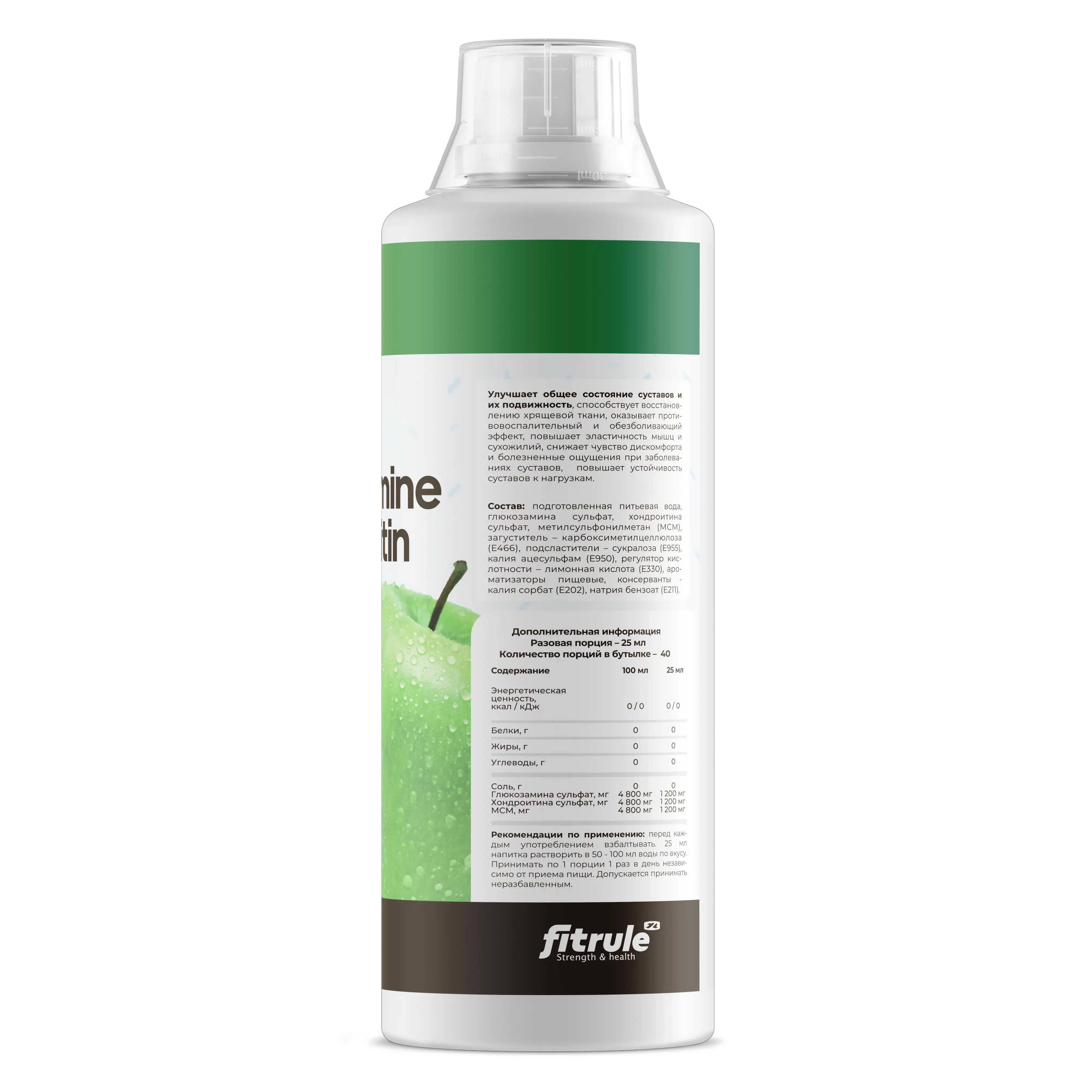 Состав: подготовленная питьевая вода, глюкозамина сульфат, хондроитина сульфат, метилсульфонилметон (МСМ), загуститель — карбоксиметилцеллюлоза (Е466), подсластители — сукролоза (Е955), калия оцесульфам (Е95О), регулятор кислотности — лимонная кислота (ЕЗЗО), ароматизаторы пищевые, консерванты - калия сорбат (Е2О2), натрия бензоат (Е211).