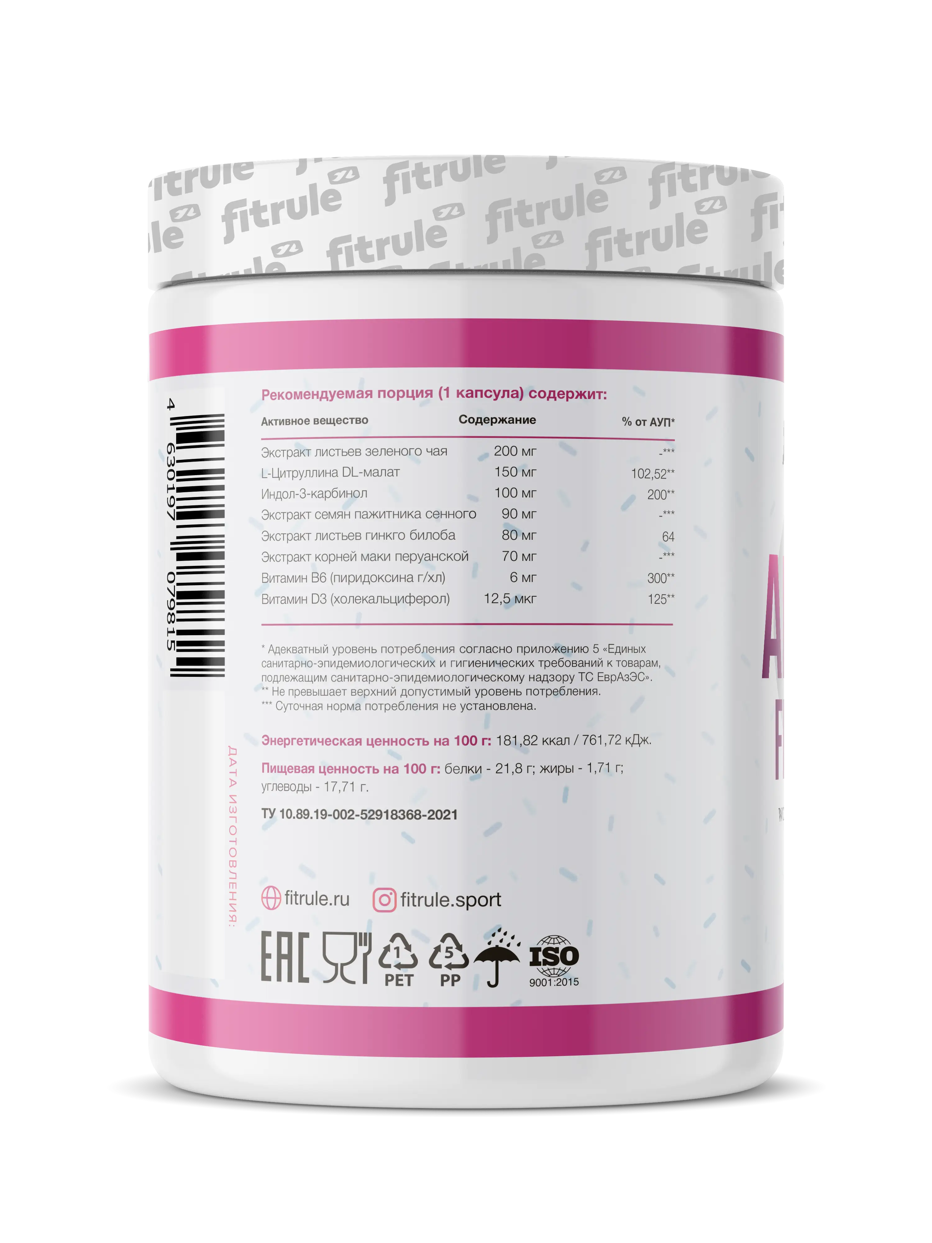 Состав: экстракт листьев зеленого чая, индол-З-карбинол, L-цитруллина экстракт семян пажитника сенного, экстракт листьев гинкго билоба, экстракт корней маки перуанской, пиридоксина гидрохлорид (витамин Вб), холекальциферол (витамин D3), желатиновая капсула (желатин — загуститель, диоксид титана — краситель), антислеживающий агент — диоксид кремния.