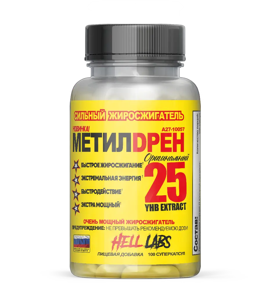 Hell Labs Метилдрен 25 100 caps – это отечественный аналог всемирно известного жиросжагателя, но полностью с разрешенными компонентами в составе, которые проходят любой допинг-контроль. В составе отсутствует экстракт эфеdры, поэтому нагрузка на ЦНС и сердечно-сосудистую систему будет заметно меньше и безопаснее. Для опытных пользователей прием 2 капсул одновременно будет сопоставим по ощущениям с капсулой американского жиросжигателя.