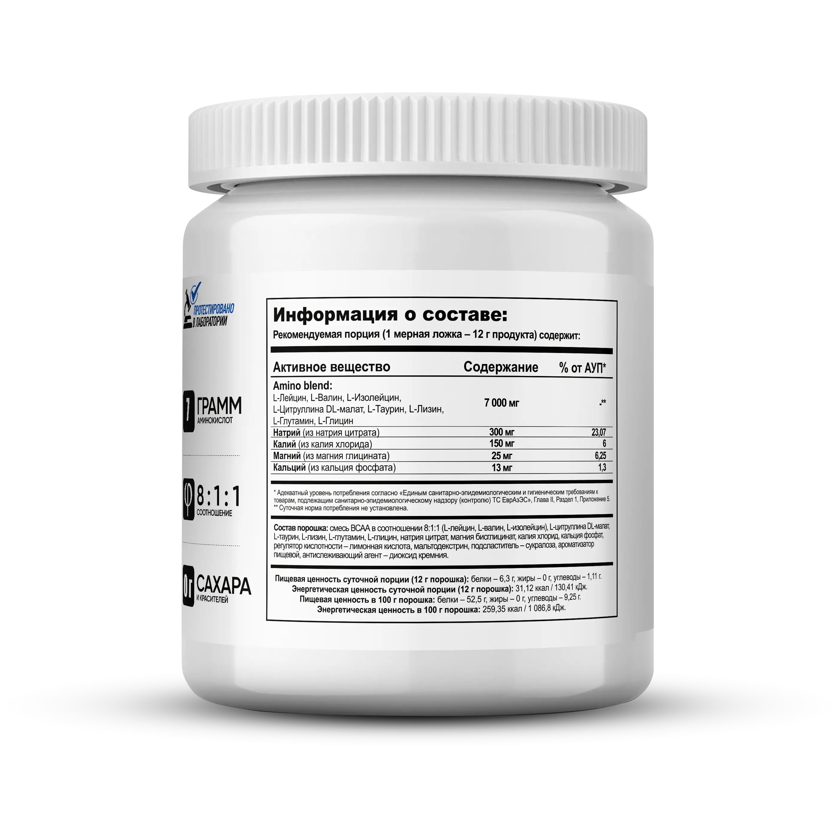 Состав порошка: смесь BCAA в соотношении 8:1:1 (L-лейцин, L-валин, L-изолейцин), L-цитруллина DL-малат, L-таурин, L-лизин, L-глутамин, L-глицин, натрия цитрат, магния бисглицинат, калия хлорид, кальция фосфат, регулятор кислотности - лимонная кислота, мальтодекстрин, подсластитель - сукралоза, ароматизатор пищевой, антислеживающий агент - диоксид кремния.