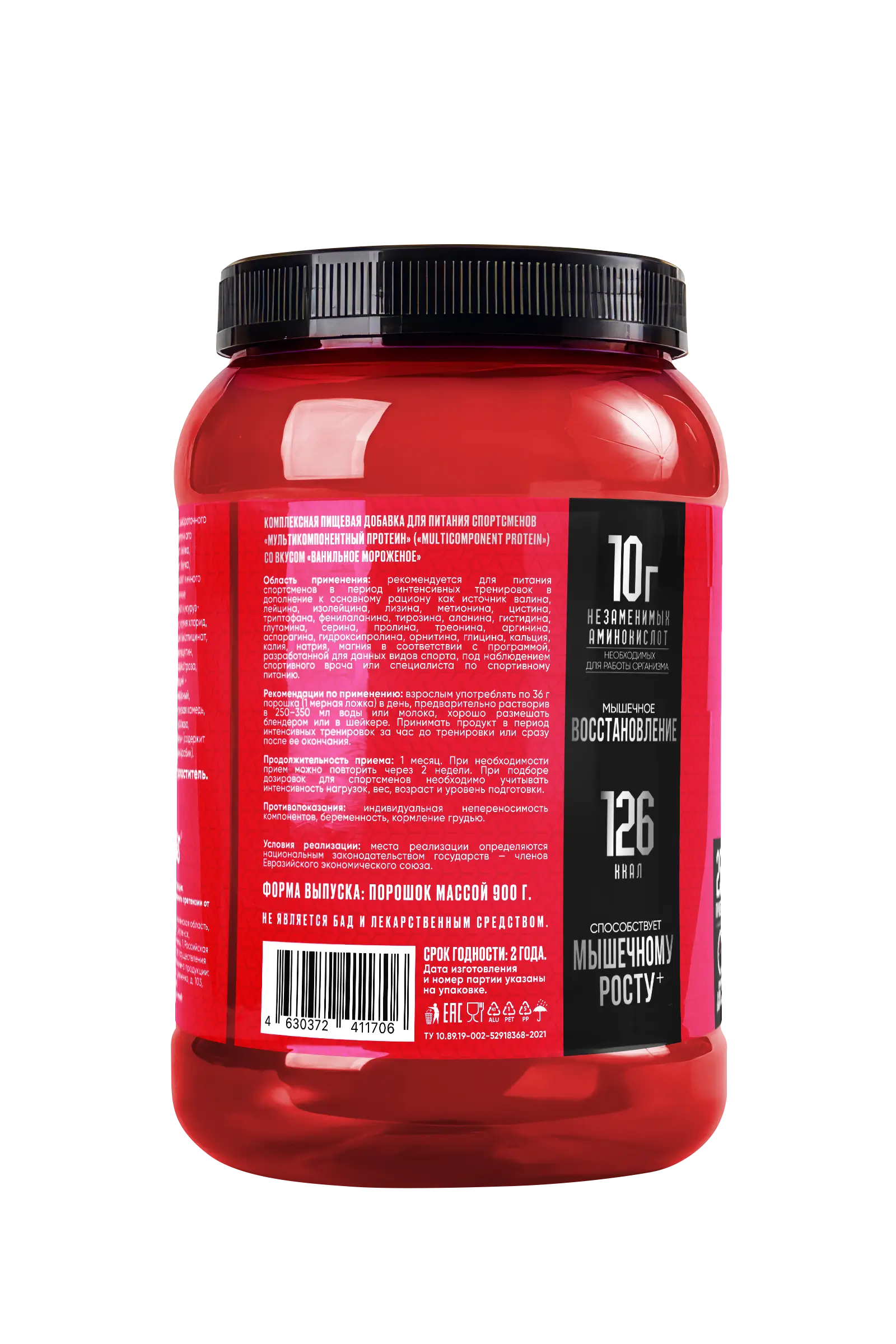 концентрат сывороточного белка, концентрат молочного белка, изолят соевого белка, гидролизат говяжьего белка, кальция казеинат, изолят яичного белка, среднецепочечные триглицериды, крахмал кукурузный, кальция фосфат, калия хлорид, натрия цитрат, магния бисглицинат, эмульгатор — соевый лецитин, стабилизатор — полидекстроза, агент антислеживающий — диоксид кремния аморфный, загуститель — ксантановая камедь, подсластитель — сукралоза, ароматизатор «Ваниль» (содержит стабилизатор — гуммиарабик).