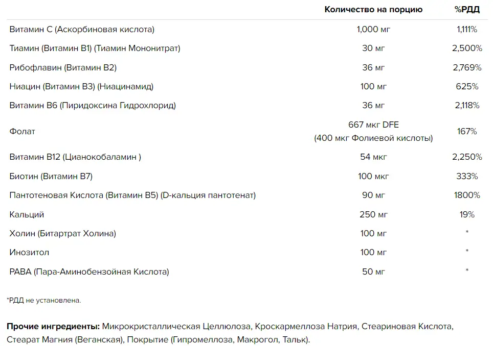 В комплексе витамины работают в паре с холином. Холин — это питательное вещество, которое играет множество ролей в организме, от создания клеточных мембран до передачи сигналов между клетками. Он поддерживает здоровую память и помогает обрабатывать информацию. Также, он может помочь справиться со стрессом и уменьшить чувство тревоги.