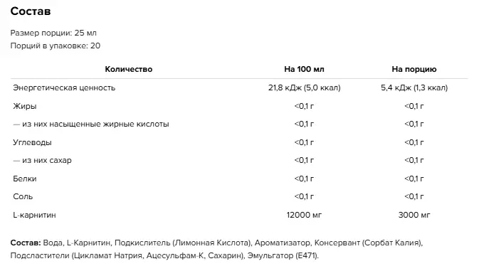 Ингредиенты: вода, L-карнитин, лимонная кислота, ароматизатор, сорбат калия, подсластители (цикламат натрия, ацесульфам-K, сахарин), эмульгатор (Е471).