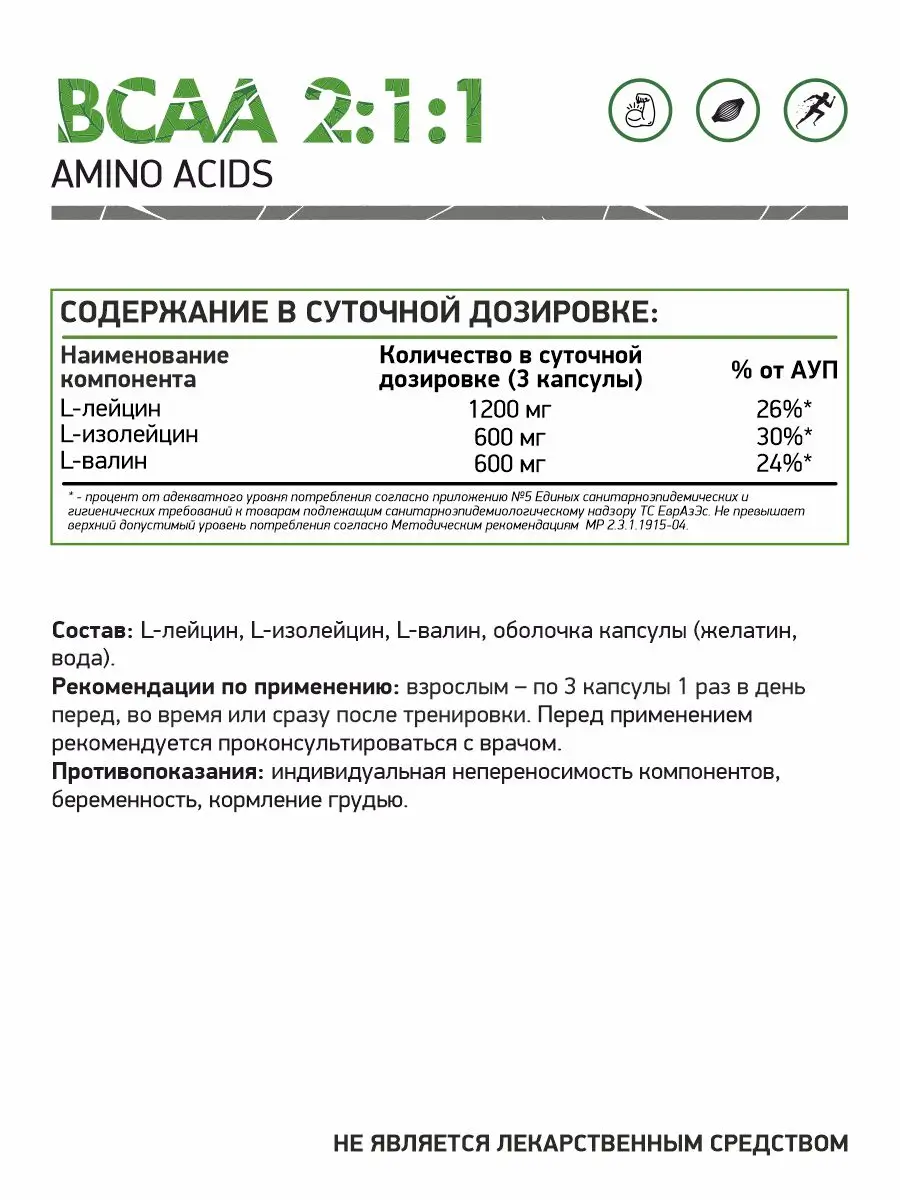 Прием BCAA перед, во время или сразу после физической нагрузки позволяет быстро повысить уровень незаменимых аминокислот в крови, тем самым создавая необходимые условия для успешного протекания физиологических, биохимических реакций организма и восстановления энергетического потенциала клеток.