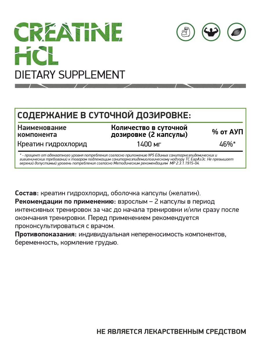 Creatine HCL- является органическим соединением, относимым к группе карбоновых кислот. Эта азотосодержащая кислота синтезируется в человеческом организме и содержится в ряде тканей, в первую очередь – в мускулах. Задача креатина сводится к поддержанию энергетического баланса, в частности внутри мышечных структур и клеток нервной системы Креатин участвует в энергетическом обмене в мышечных и нервных клетках. Широко используется для увеличения силы, мышечной массы и кратковременной анаэробной выносливости, обладает экспериментально доказанной безопасностью. Основные эффекты креатина: увеличение силы, увеличение мышечной массы, увеличение секреции анаболических гормонов (тестостерон, соматотропин). Форма гидрохлорида рядом экспертов признается эффективнее традиционной формы моногидрата.