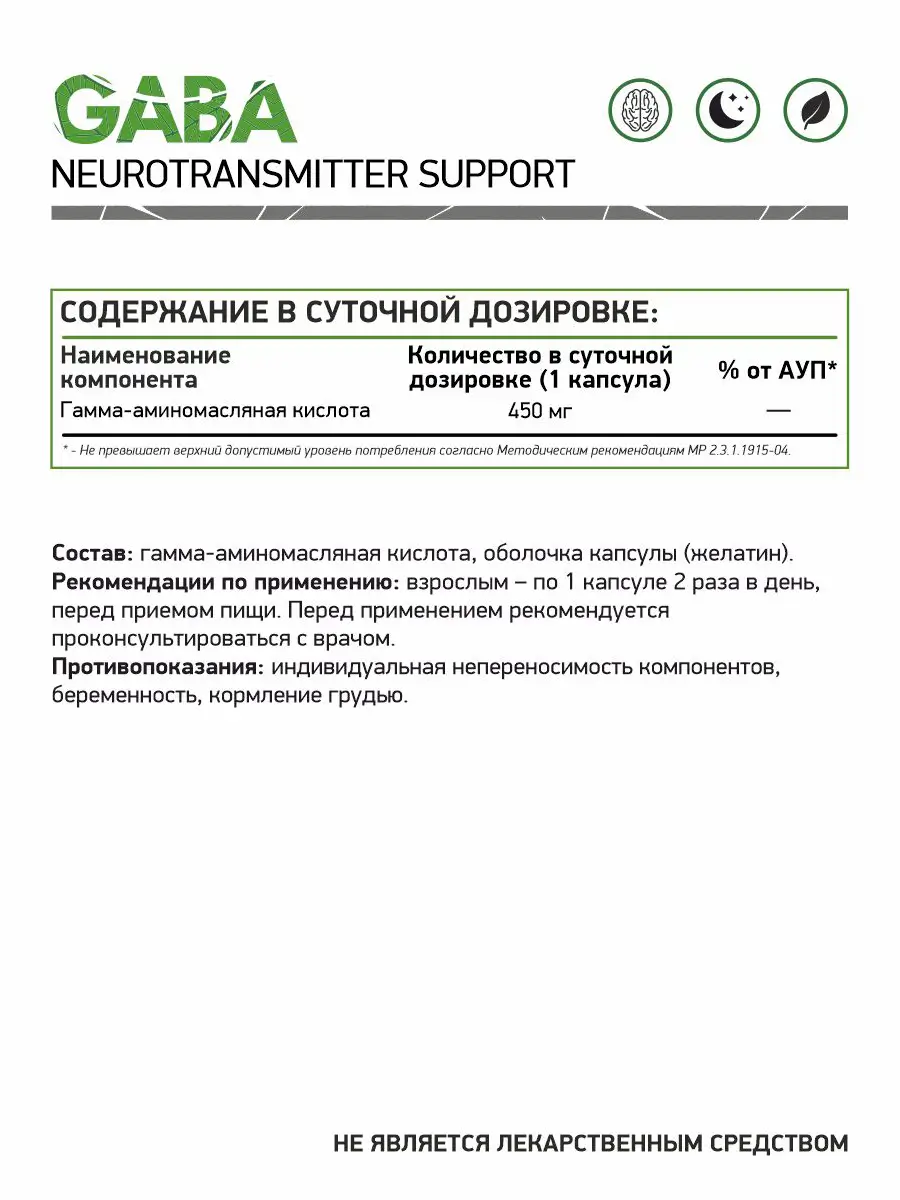 ГАБА (Гамма-аминомасляная кислота) - является одним из основных медиаторов торможения периферической и центральной нервной системы (ЦНС). ГАМК вызывает гиперполяризацию постсинаптической мембраны, в результате чего снижается нейрональная активность целевой клетки. Улучшает функциональное состояние головного мозга за счет восстановления процессов метаболизма тканей и влияния на мозговое кровообращение. Оказывает психостимулирующее, успокаивающее и антиоксидантное действие. Повышает продуктивность мышления, улучшает память. Восстанавливает физическую и умственную трудоспособность при переутомлении.