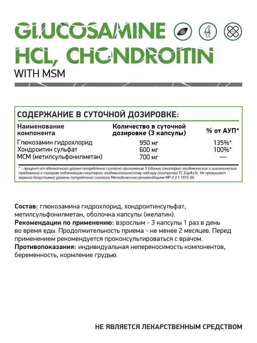 Глюкозамин, Хондроитин, МСМ - комплексная пищевая добавка, предназначенная для поддержания здоровья, защиты и восстановления связочно-суставного аппарата. В состав препарата входят два основных компонента – хондроитин и глюкозамин.