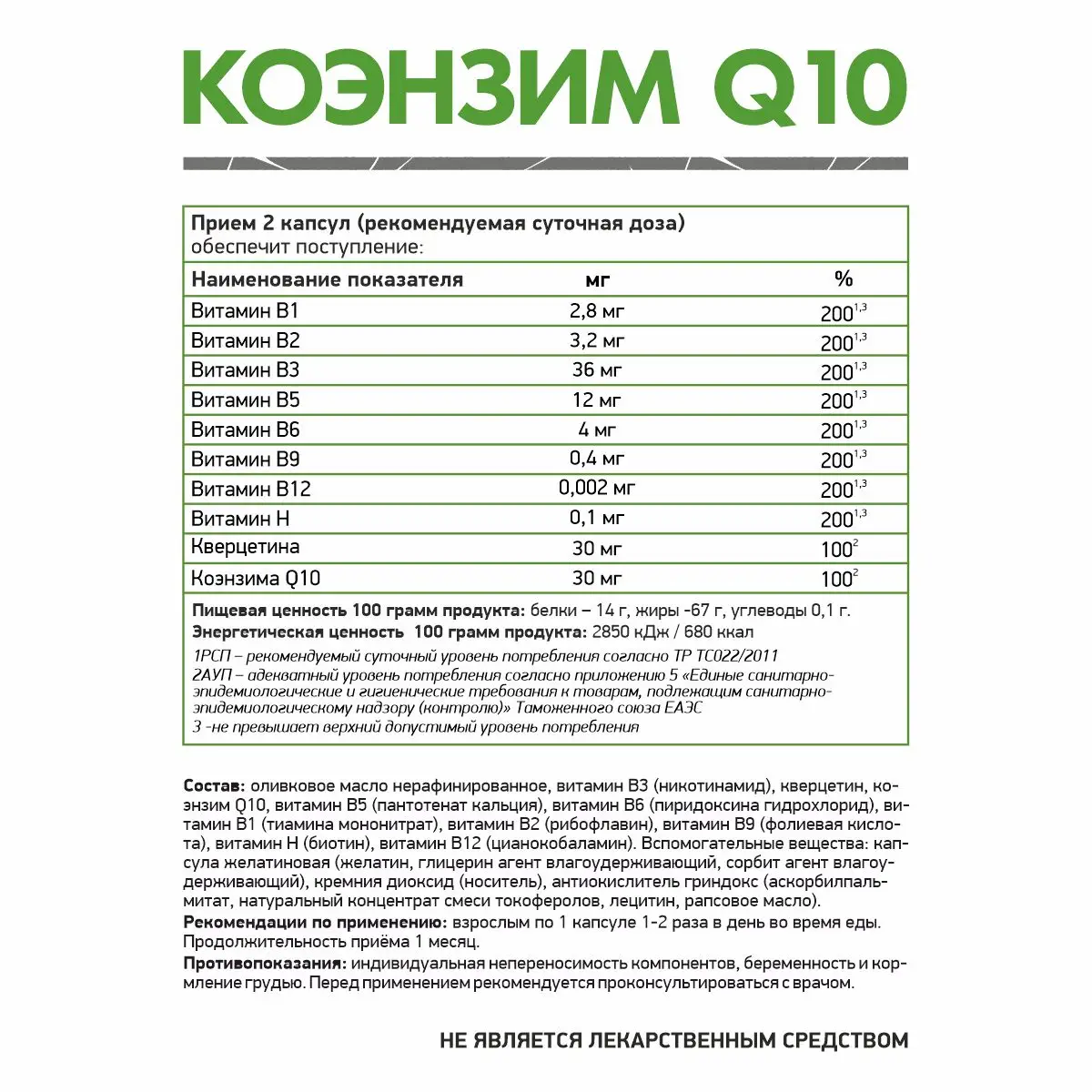 Коэнзим Q10 - уникальный биологически активный комплекс в легкоусвояемой биодоступной форме, способствующий защите организма от окислительного стресса. Коэнзим способствует сжиганию и преобразованию в энергию не только вновь поступающих жиров, но и тех, что базируются в жировом депо. При нормальном липидном обмене улучшается выведение токсинов, шлаков, на 100% усваивается потребляемая пища. Также Q10 нормализует высокое давление, улучшает работу сердца и приводит в норму метаболические процессы. Комплекс также направлен на снижение отложений липофусцина в клетках и профилактику липофусциноза. Биологически активная добавка к пище рекомендуется в качестве дополнительного источника витаминов В1, В2, В3, В5, В6, В9, В12, Н, источника кверцетина, коэнзима Q10.