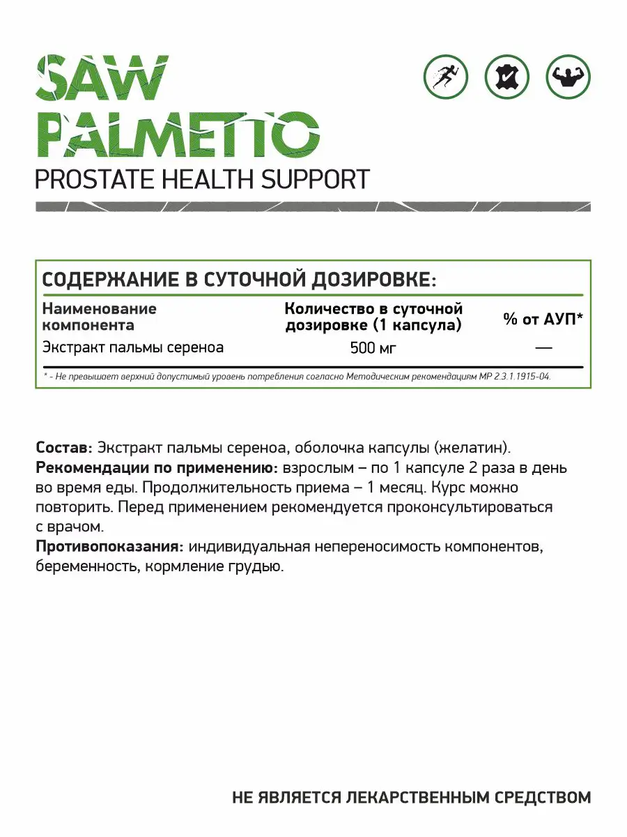 Самым эффективным образом комплексная пищевая добавка Saw Palmetto показала себя в качестве средства для поддержки мужского здоровья. Основными свойствами являются: стимуляция функционирования гормональной системы, нормализация соотношения половых гормонов, а также улучшение выработки тестостерона.