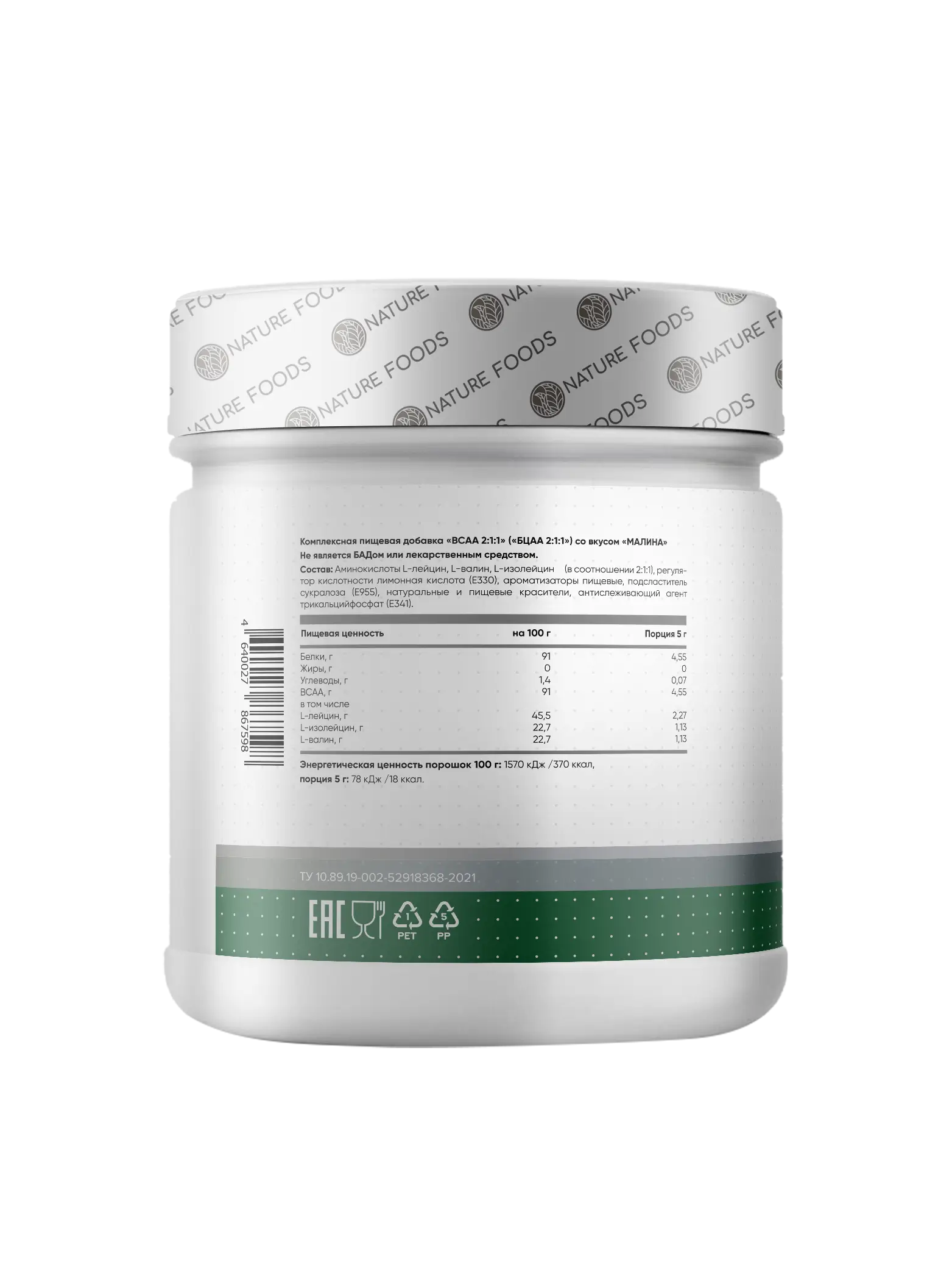 Nature Foods BCAA – это аминокислотный комплекс, включающий три наиболее важных для мышц аминокислоты – лейцин, изолейцин и валин. Эти аминокислоты выполняют три главных для организма функции: восстановление мышиной ткани, защита мышц от катаболизма и поддержание уровня энергии во время нагрузки.