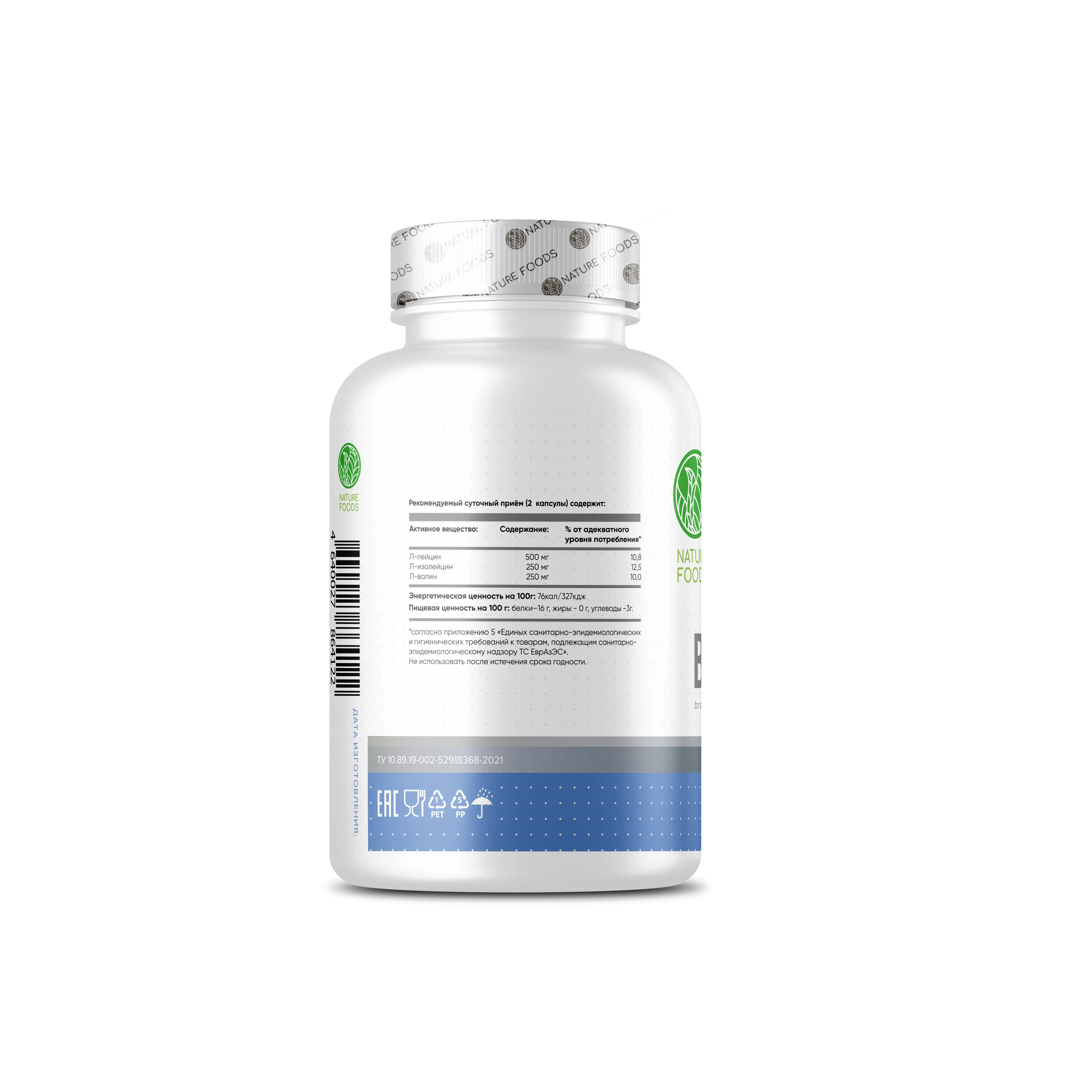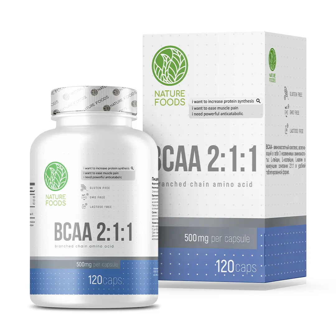 Nature Foods BCAA 2:1:1 500mg – это комплекс трех незаменимых аминокислот – лейцины, изолейцины и валина – в капсулах, которые в наибольшей степени важны для роста, защиты и восстановления мышечной ткани.