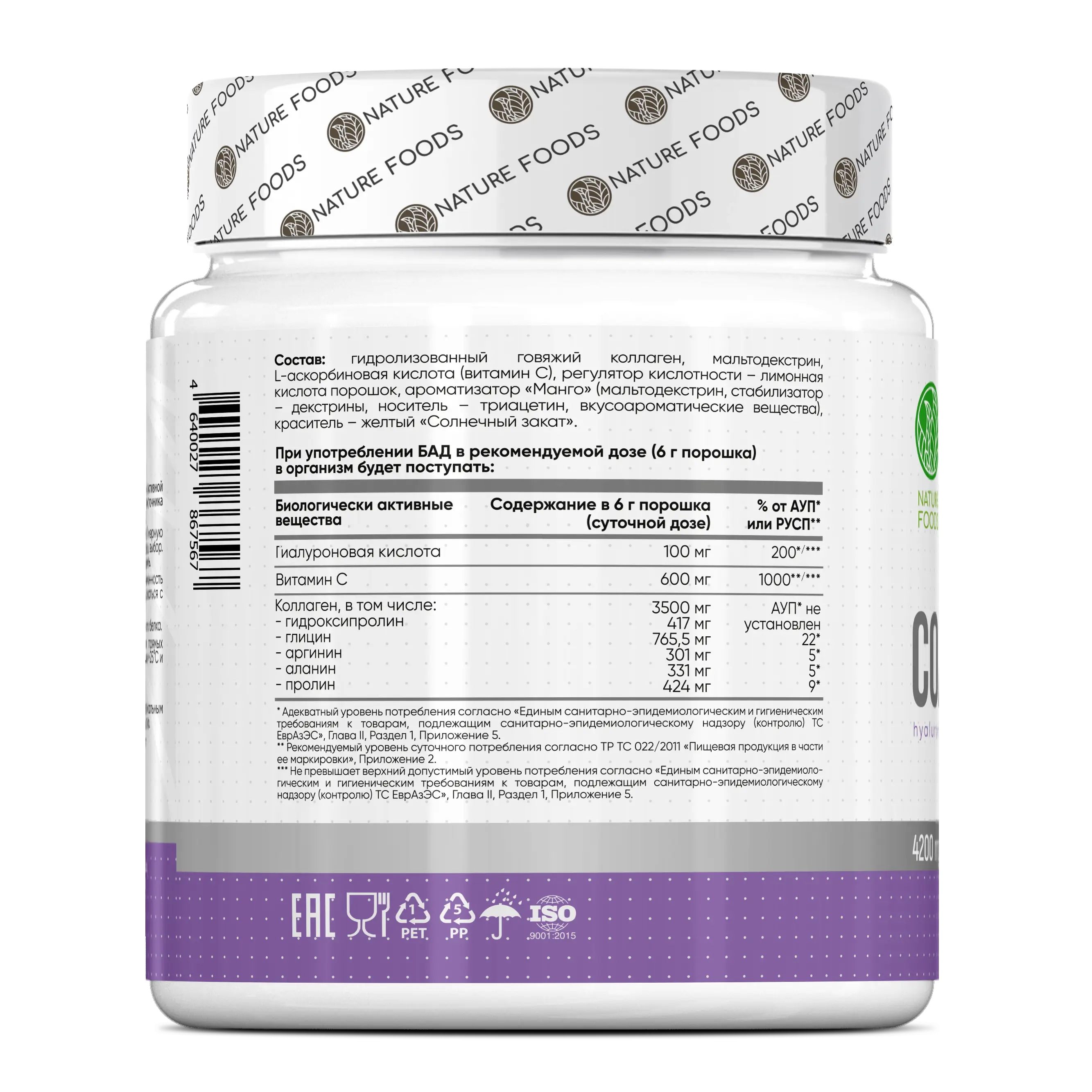 Комплекс красоты и молодости в одной формуле — гидролизованный коллаген, гиалуроновая кислота и витамин C. Nature Foods объединил три ключевых компонента для поддержки кожи, суставов, волос и ногтей в удобной порошковой форме с отличной усвояемостью.