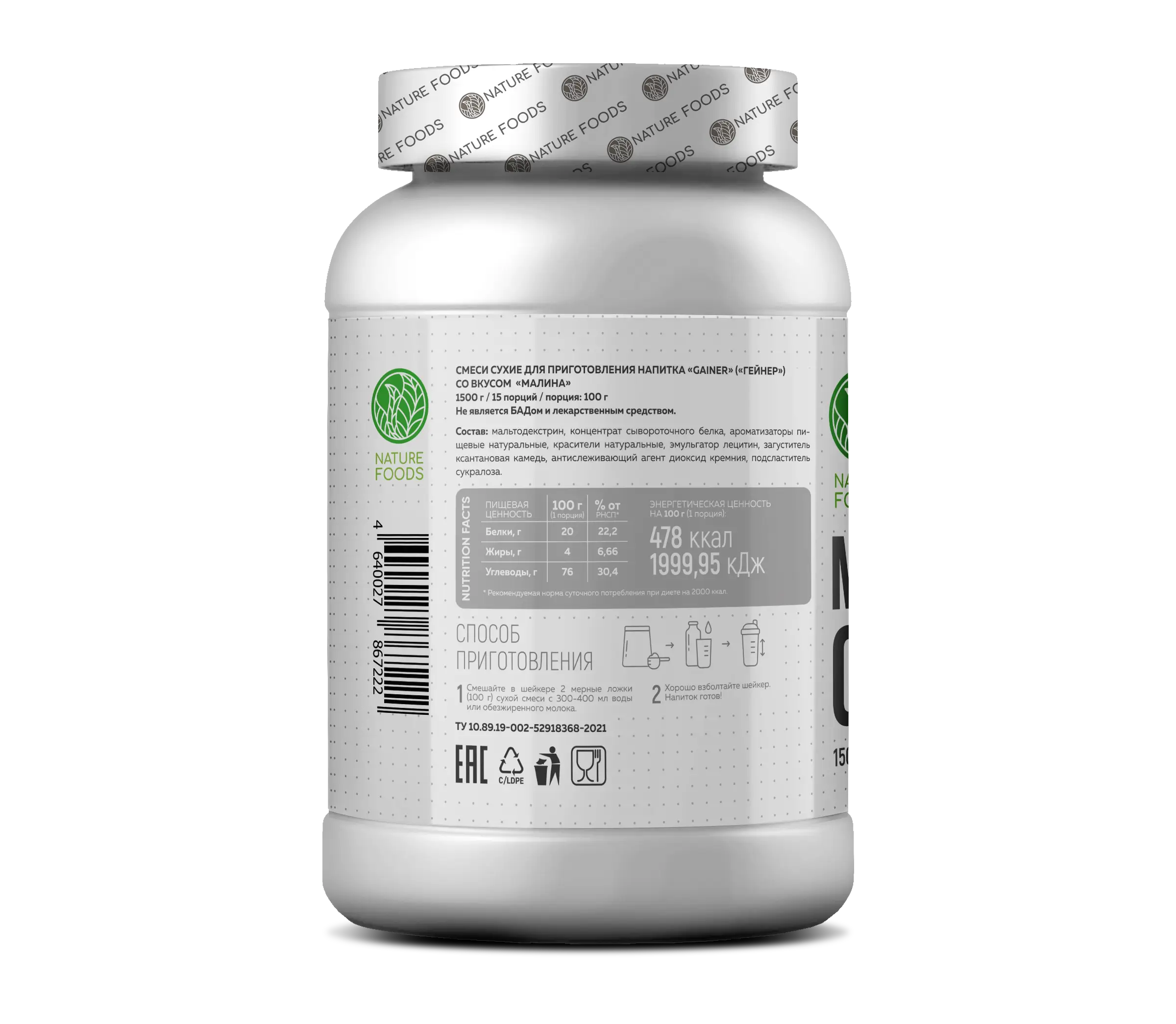 Nature Foods Gainer – это высокобелковый гейнер на быстрых углеводах. Необходим прежде всего для тех, кто испытывает проблемы с набором веса и мышечной массы. Идеально подходит для восполнения энергии тем, кто имеет не стабильный рацион питания, с большими перерывами между приемами пищи.