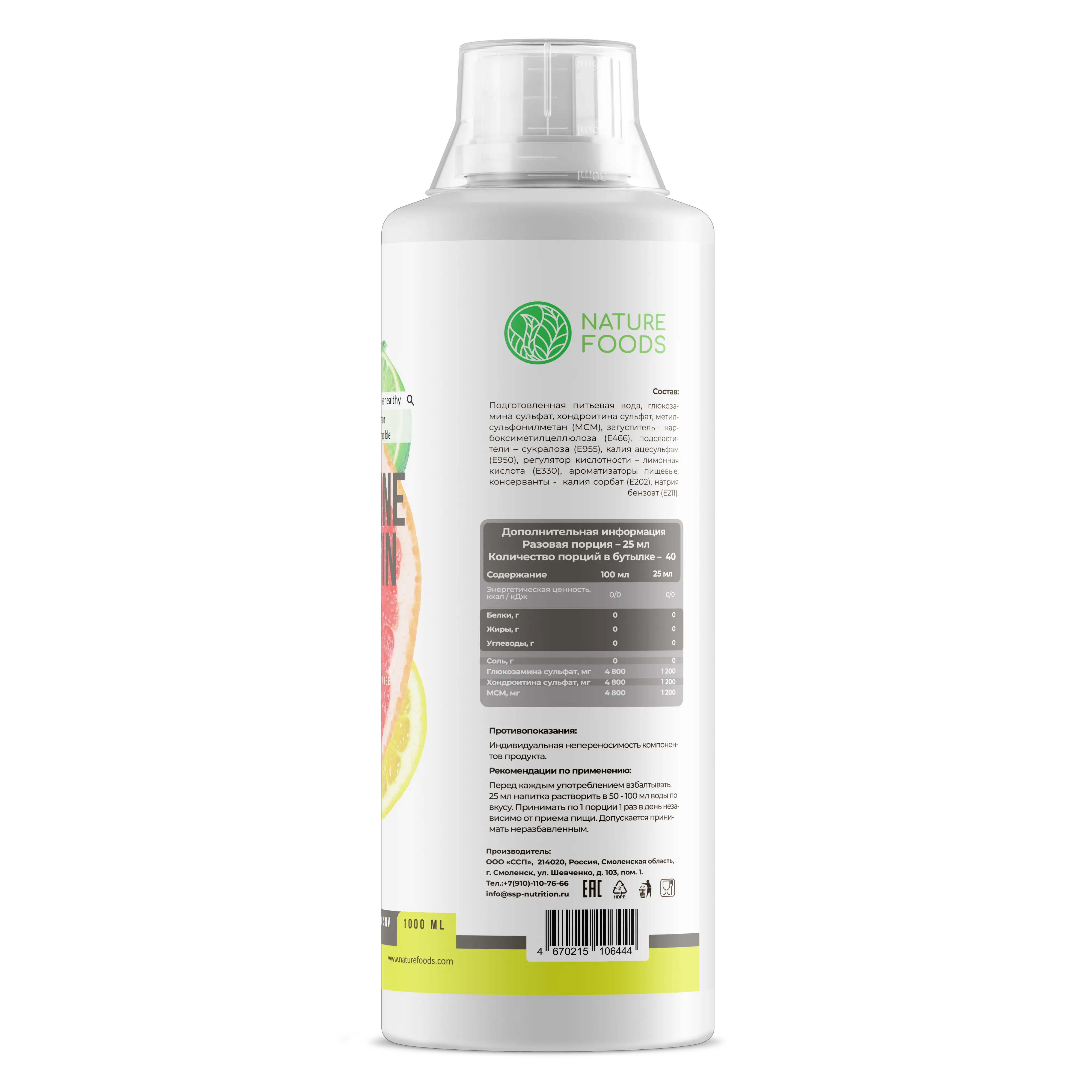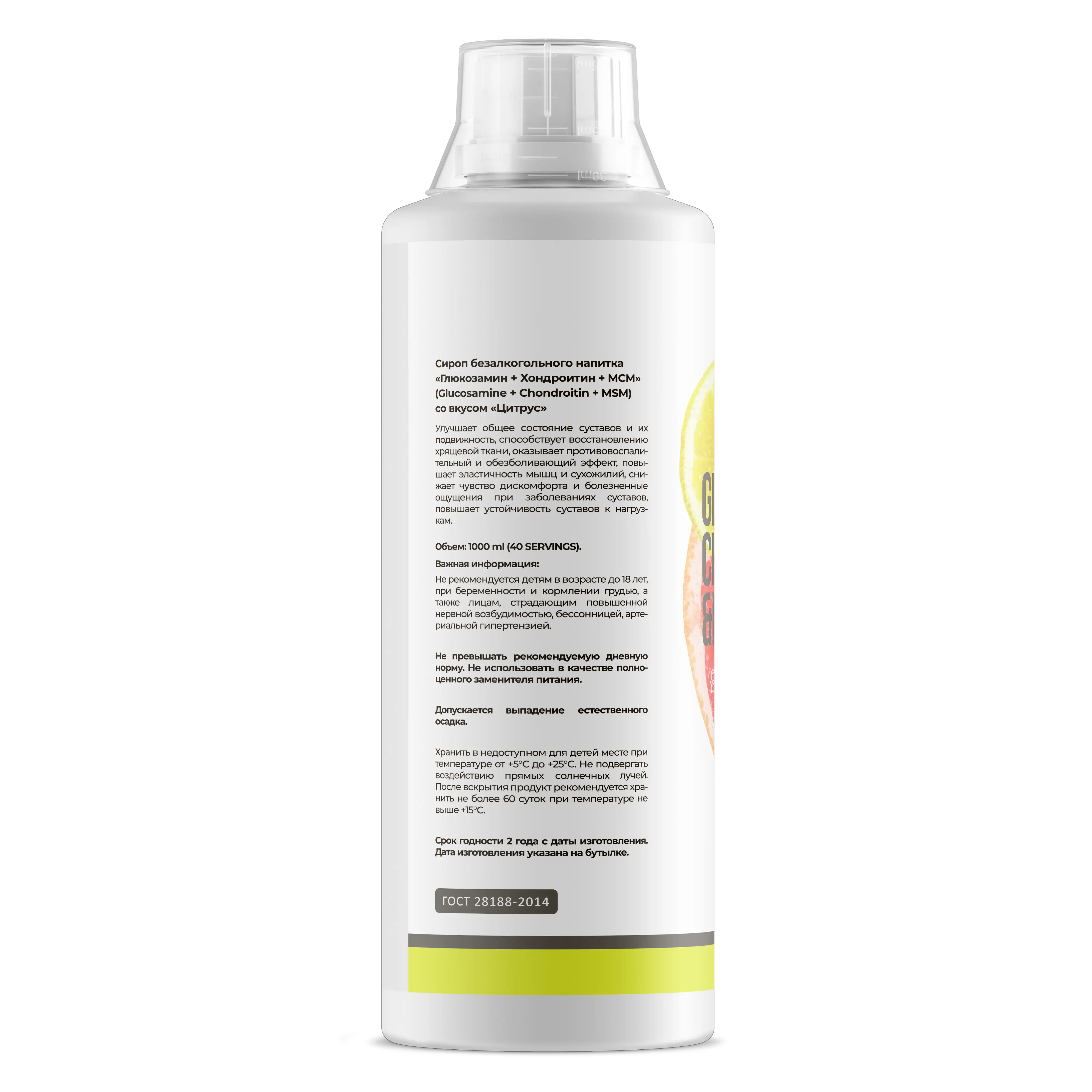 Состав: подготовленная питьевая вода, глюкозамина сульфат, хондроитина сульфат, метилсульфонилметон (МСМ), загуститель — карбоксиметилцеллюлоза (Е466), подсластители — сукролоза (Е955), калия оцесульфам (Е95О), регулятор кислотности — лимонная кислота (ЕЗЗО), ароматизаторы пищевые, консерванты - калия сорбат (Е2О2), натрия бензоат (Е211).