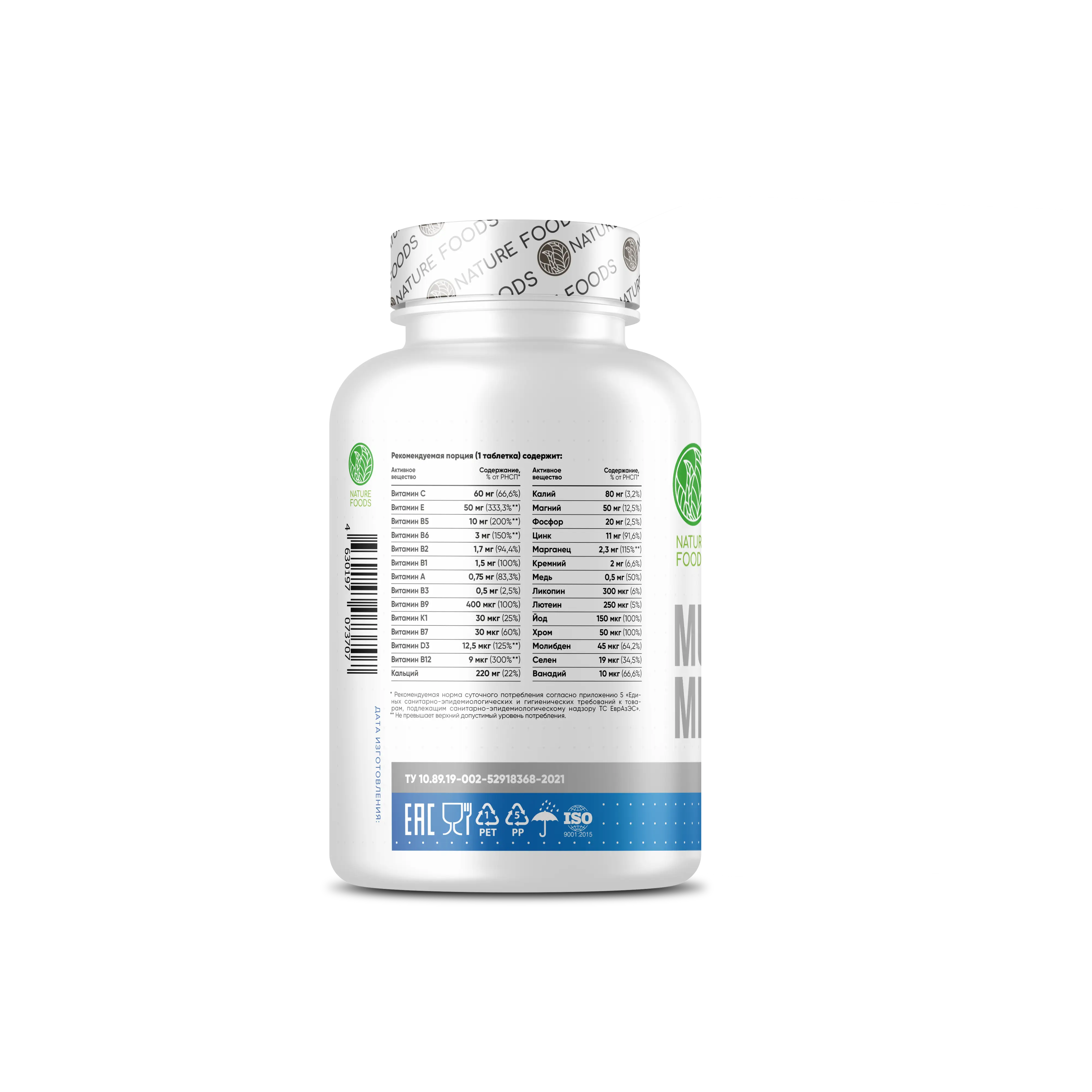 Состав: кальция карбонат, магния оксид, калия фосфат, натрия фосфат, витамин C (аскорбиновая кислота), железа карбонат, витомин Е (О-альфо токофероло ацетат), витамин ВБ (О-пантотенат кальция), витамин РР (ниацин), цинко оксид, калия йодид, натрия молибдат, марганца сульфат, кремния диоксид, витамин Вб (пиридоксина гидрохлорид), меди сульфат, витамин В2 (рибофлавин), витамин ВЛ (тиамина мононитрат), витамин А (ретинола ацетат, бета-каротин), селенометионин, витамин В9 (фолиевая кислота), хрома пиколинат, ванадия аспартат, витамин К1 (фитоменадион), витамин В7 (биотин), витамин D3 (холекальциферол), витамин в12 (цианокобаламин), микрокристаллическая целлюлоза (E460i), оболочка таблетки (гидроксипропилметилцеллюлоза (Е464)), поливиниловый спирт (Е120З), полиэтиленгликоль(8521), диоксид титана (Е171), полидекстрозо (Е1200), тальк (E553ii), стеарат магния (Е470), кроскарамеллоза (Е468).