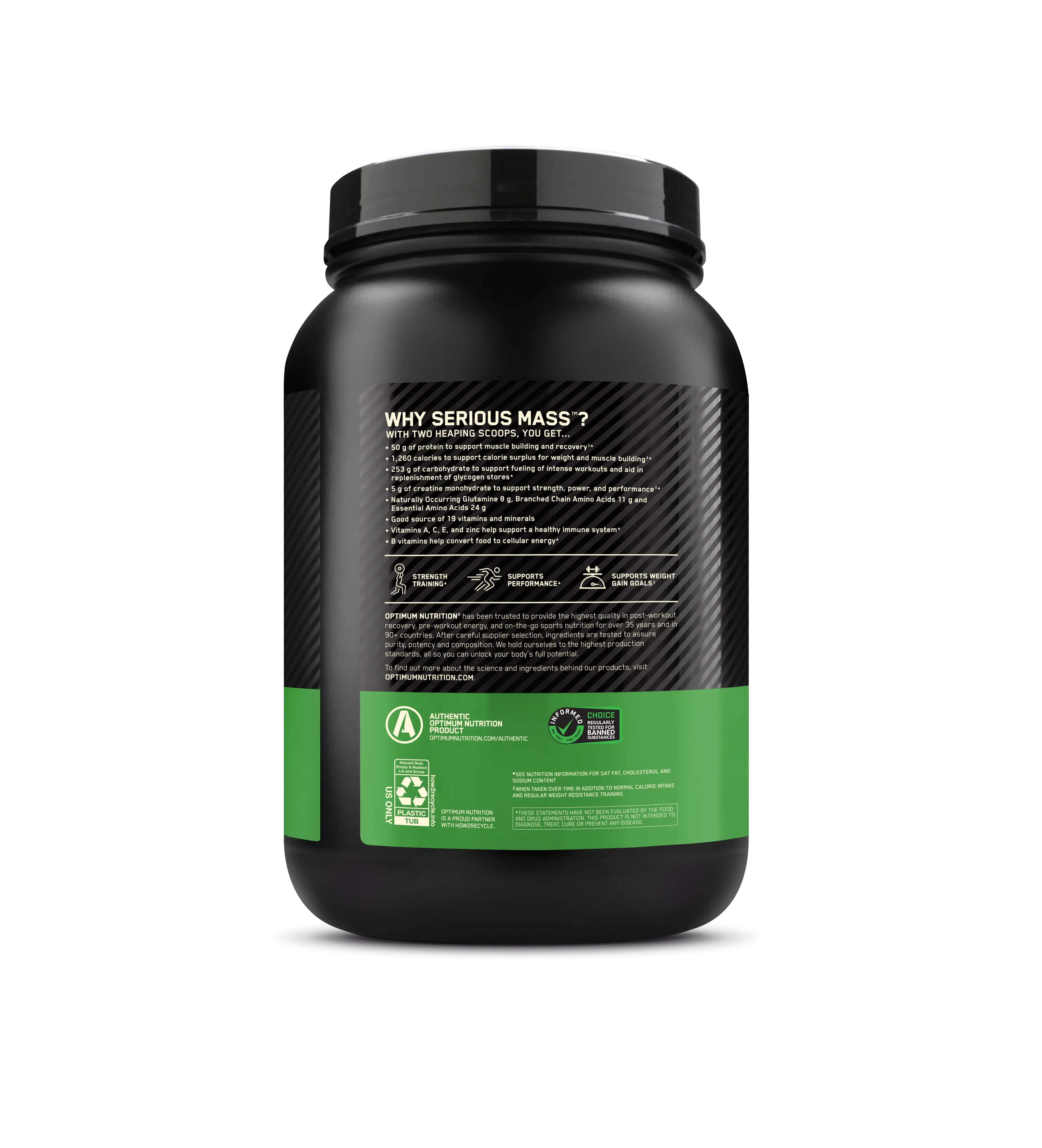 SERIOUS MASS от компании Optimum Nutrition - это белково-углеводный продукт для набора массы. Этот многокомпонентный гейнер является комплексом высококачественной белковой смеси (сывороточный протеин, казеинат кальция, яичный альбумин) и углеводов.