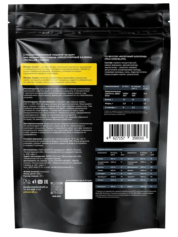 Prime Kraft Специализированный пищевой продукт диетического профилактического питания "Мицеллярный казеин" (Micellar Casein)дойпак 900 г