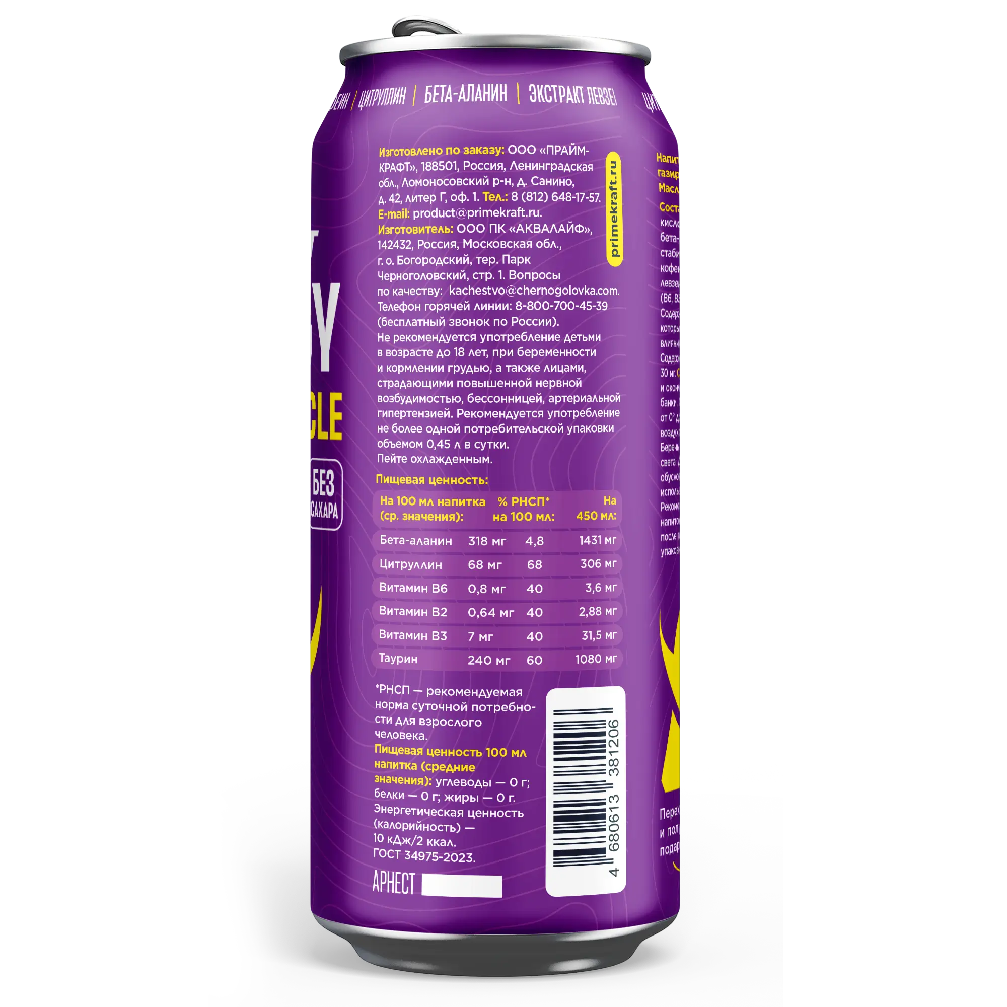 PRIME KRAFT Напиток безалкогольный тонизирующий газированный "Праймкрафт Энерджи Спорт Масл" 450 мл
