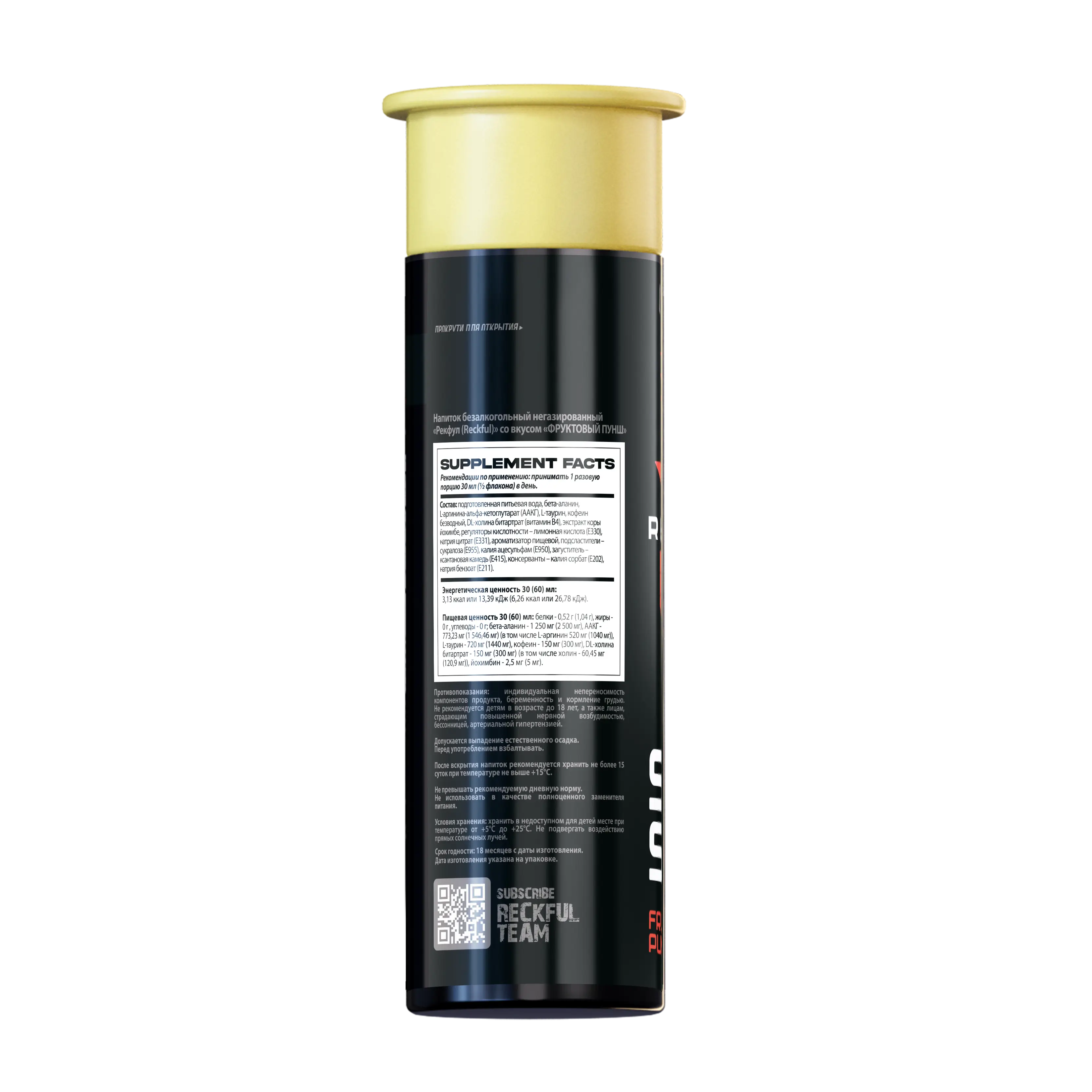 Состав: подготовленная питьевая вода, бета-аланин, L-аргинин-альфа-кетоглутарат (ААКГ), L-таурин, кофеин безводный, DL-холина битартрат (витамин В4), экстракт коры йохимбе, регуляторы кислотности – лимонная кислота (Е330), натрия цитрат (Е331), ароматизатор пищевой, подсластители – сукралоза (Е955), калия ацесульфам (Е950), загуститель – ксантановая камедь (Е415), консерванты – калия сорбат (Е202), натрия бензоат (Е211).