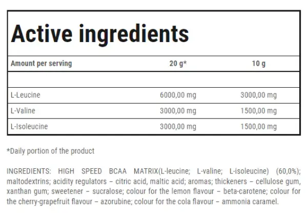 BCAA HIGH SPEED — это высококачественная пищевая добавка с аминокислотами с разветвленной цепью. Этот растворимый продукт был произведен с использованием специальной производственной технологии и характеризуется очень хорошей растворимостью и превосходным вкусом. BCAA HIGH SPEED содержит L-лейцин, L-валин и L-изолейцин в оптимальном для организма соотношении 2:1:1. Препарат BCAA HIGH SPEED выпускается в форме вкусного напитка, который мгновенно восполняет уровень ключевых аминокислот с разветвленной цепью.
