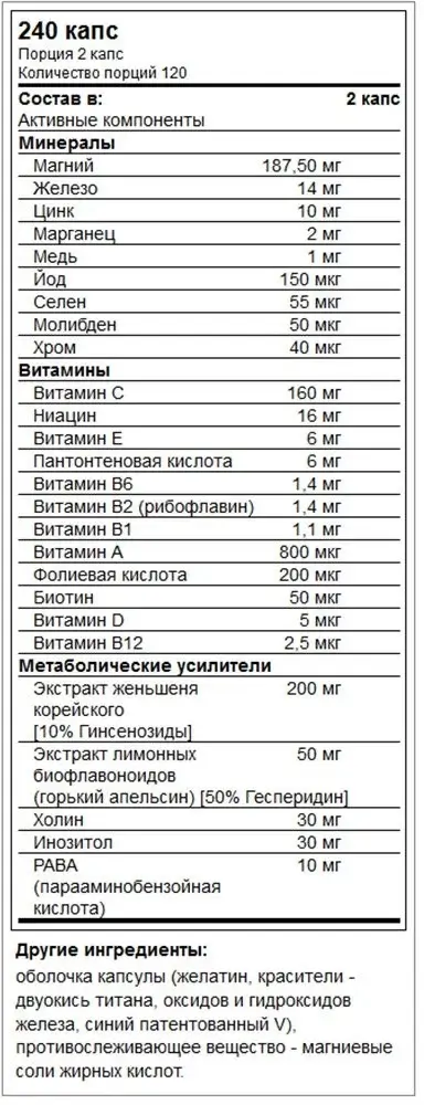 - Метаболические усилители – экстракт женьшеня, биофлавоноиды, холин, инозитол и PABA для улучшения когнитивных функций, снижения усталости и поддержания антиоксидантной защиты.